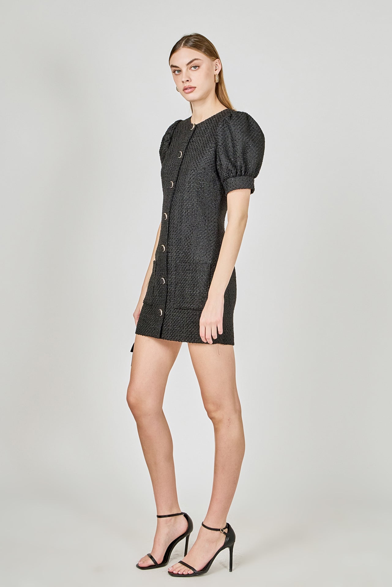 This little black dress is anything but basic. Elevate your everyday look with our Tweed Puff Sleeve Mini Dress from endless rose. With a touch of romance, this style is perfect for all occasions. The flattering fitted silhouette is complemented with puffy sleeves. It features two front pockets and beautiful gold-rimmed buttons down the front.