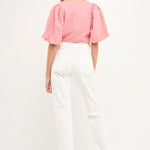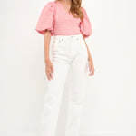 This Puff Sleeve Check Jacquard Top is perfect for a casual day out. The pretty pink color and puff sleeves make it feminine and fun, while the check pattern adds a touch of sophistication. It's crop top style makes it the perfect choice for hot summer days.