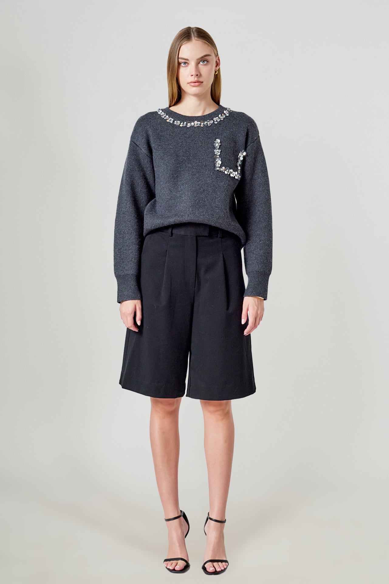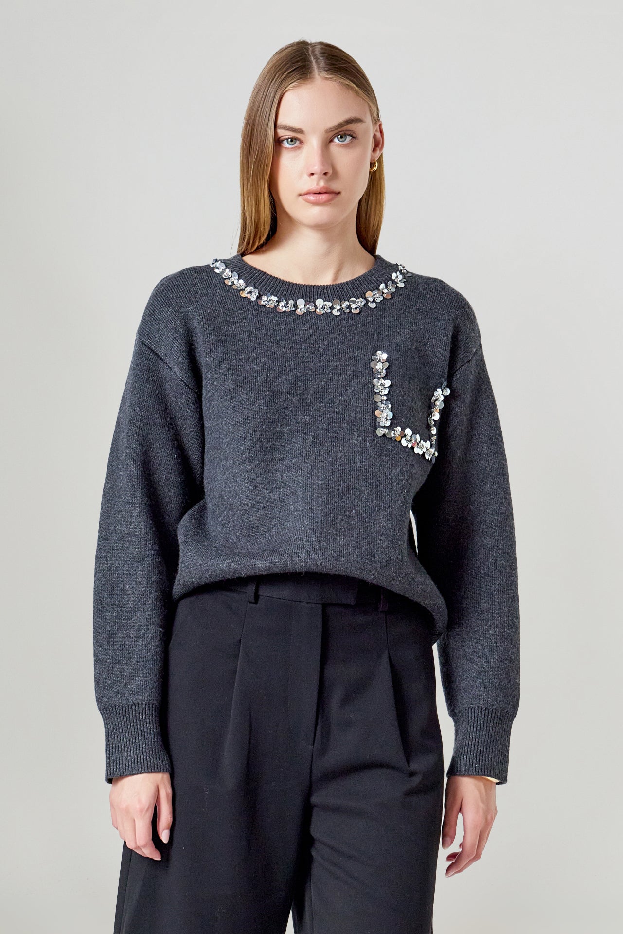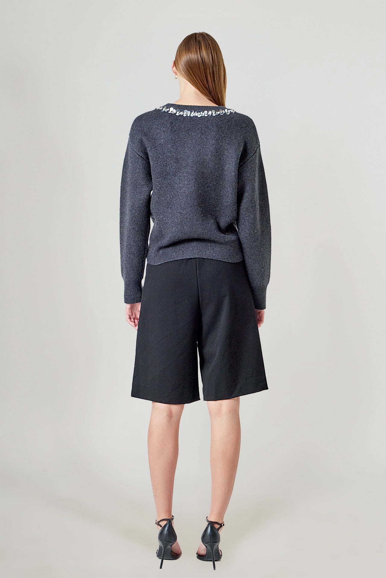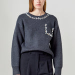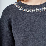 Cozy up in style with our Relaxed Jewel Trim Sweater. This must-have knit features delicate jewel trim detailing, relaxed fit, and long sleeves. Made from high-quality knit material, this sweater is not only fashionable but also comfortable. Dress it up or down, this versatile piece is a must-have in your wardrobe. Add a little sparkle to your winter rotation with this must-have knit!