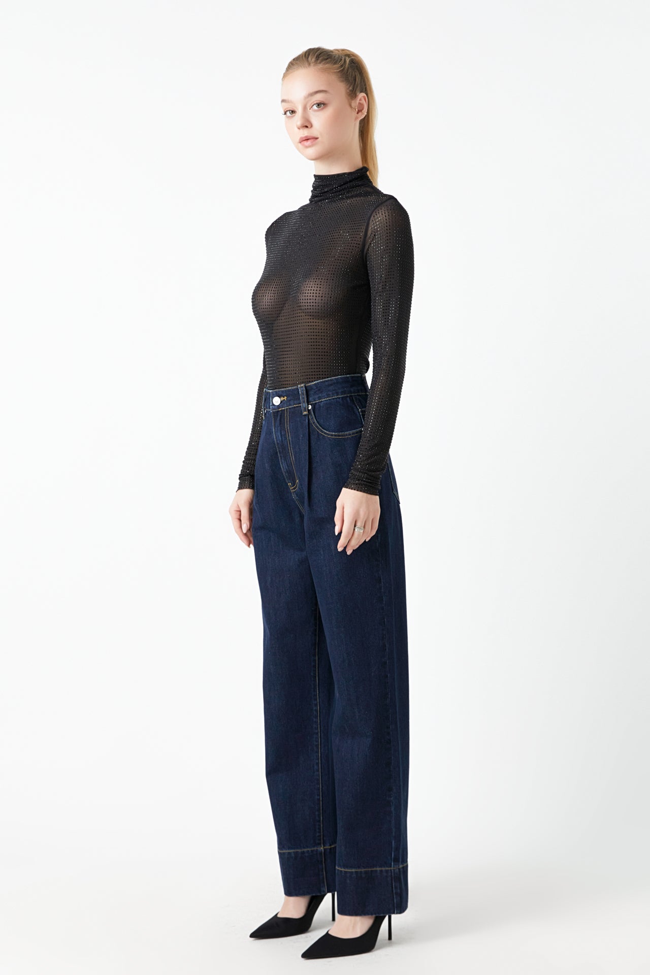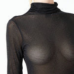 Make a statement in our Rhinestone Mesh Bodysuit. Crafted from a stunning rhinestone mesh fabric, this turtleneck top features long sleeves and a bottom snaps closure for ease of wear. Be the star of the evening in this showstopping bodysuit that will make you shine bright! Easily dress it up or down, this bodysuit is sure to become your new wardrobe favorite.