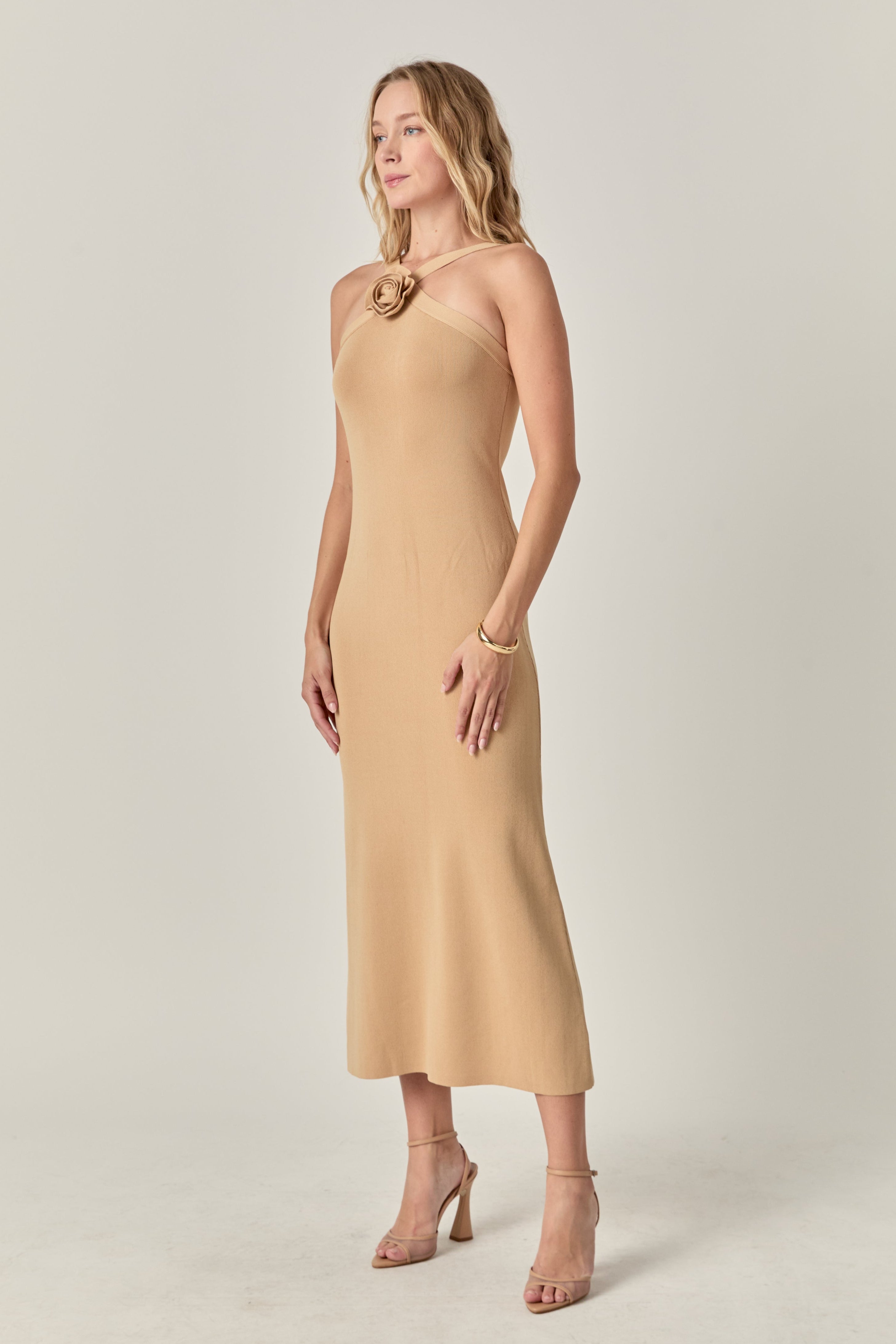 Flaunt your feminine charm with our Rosette Knit Midi Dress. Its midi length offers a perfect balance of elegance and trendiness, while the fit and flare silhouette accentuates your curves in all the right places. Made with a soft knit fabric, this dress is perfect for any season. The halter neck adds a touch of sophistication, making it an ideal choice for both casual and formal occasions. Don't miss out on this versatile and stylish dress that will surely turn heads. Shop now and add this must-have piece to your collection!