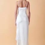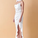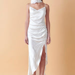 Slip into elegance. Escape the everyday in this luxurious maxi slip dress. With a cowl neckline and side ruched detail, this piece is elegant and timeless. The front slit waterfall hem is perfect for showing just the right amount of skin. Adjustable spaghetti straps make it easy to find the perfect fit, while the lining ensures you stay comfortable all night long.