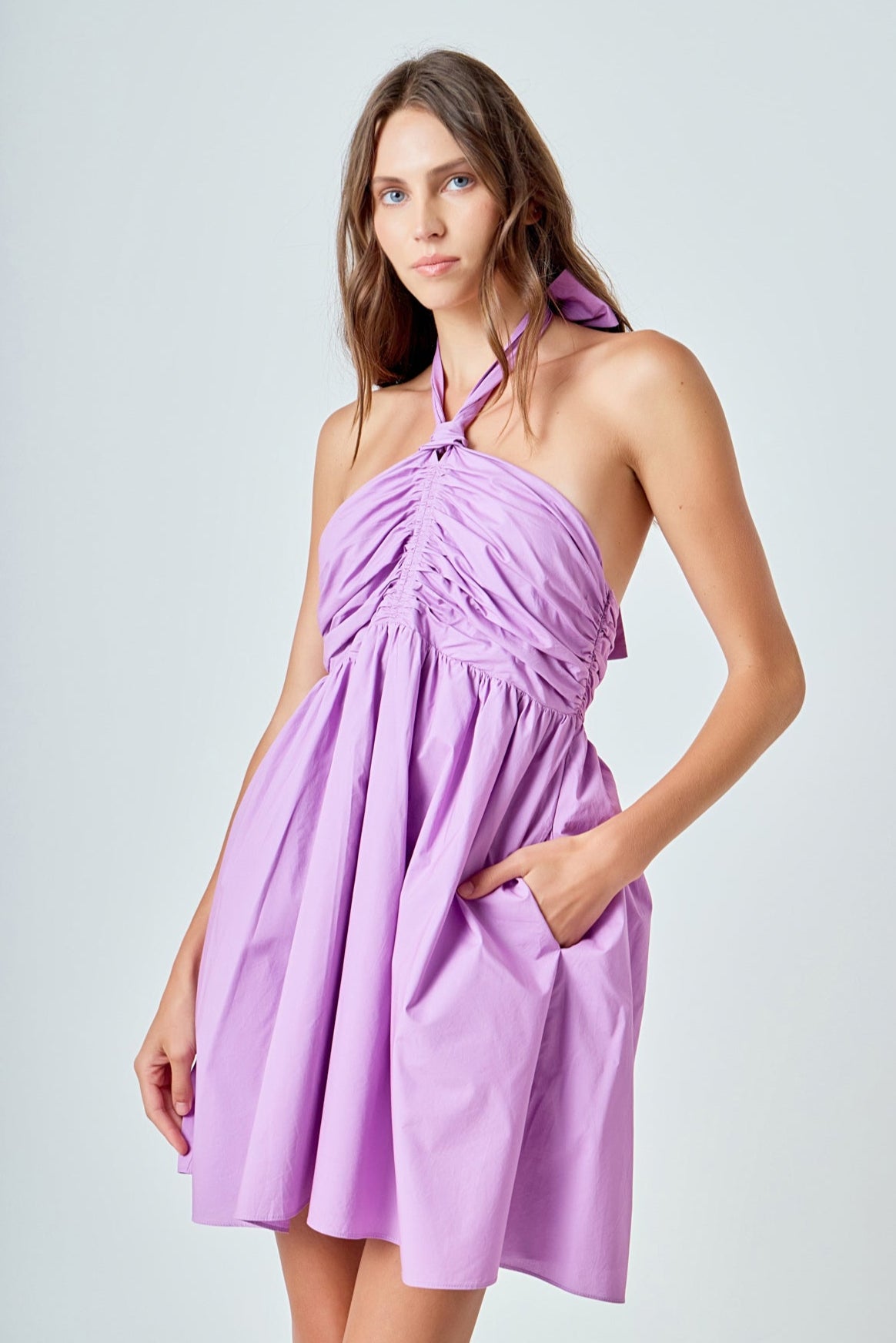 Take your style up a notch with this sexy fit and flare mini dress. With its ruched upper bodice and back smocking, this dress adds a touch of elegance to any look. The side zipper makes it easy to slip on and off, while the halter neck tie ensures a perfect fit. Whether you're dressing up for a party or going out on the town, this little number is sure to turn heads.