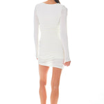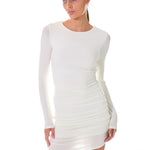 The Ruched Long Sleeve Mini Dress is a fashionable midi length dress with long sleeves a boat neck and stylish ruched detailing. It's perfect for dressing up or down - pair it with sneakers and a jean jacket or layer it over a checkered blouse for an on-trend daytime look. Our unique ruched style and midi length make this dress a must-have for any fashionista's wardrobe. Get ready for compliments with this show-stopping number!