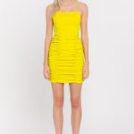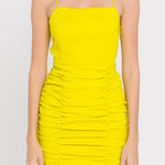 Introducing this stunning Ruched Mini Dress! Crafted with soft and stretchy fabric, this adjustable shoulder strap dress flatters all curves. The fitted silhouette is complimented by the ruched skirt that falls just above the knee, and an invisible zipper at side ensures a perfect fit. Stand out in this flattering dress and get ready to be a style standout!