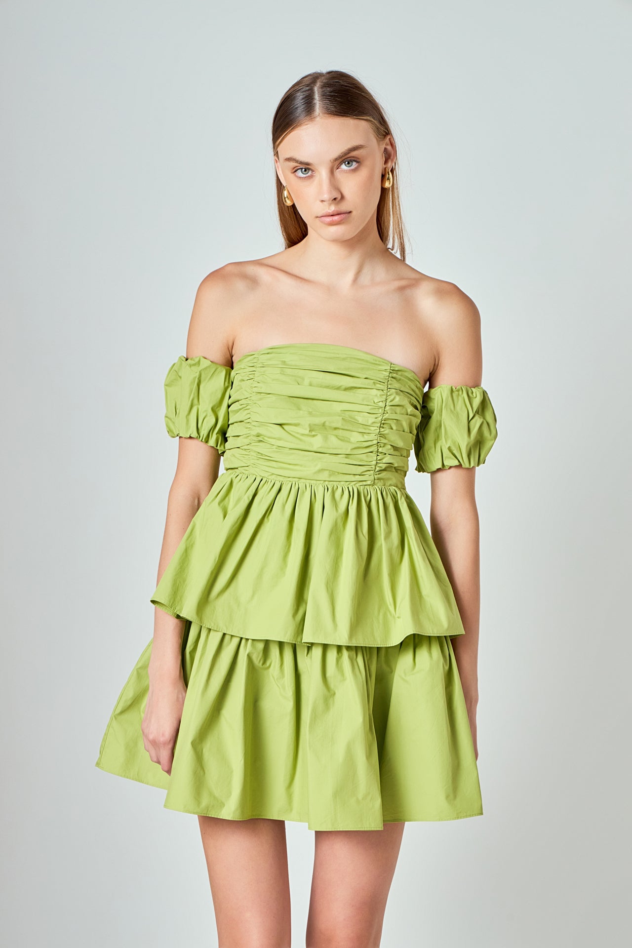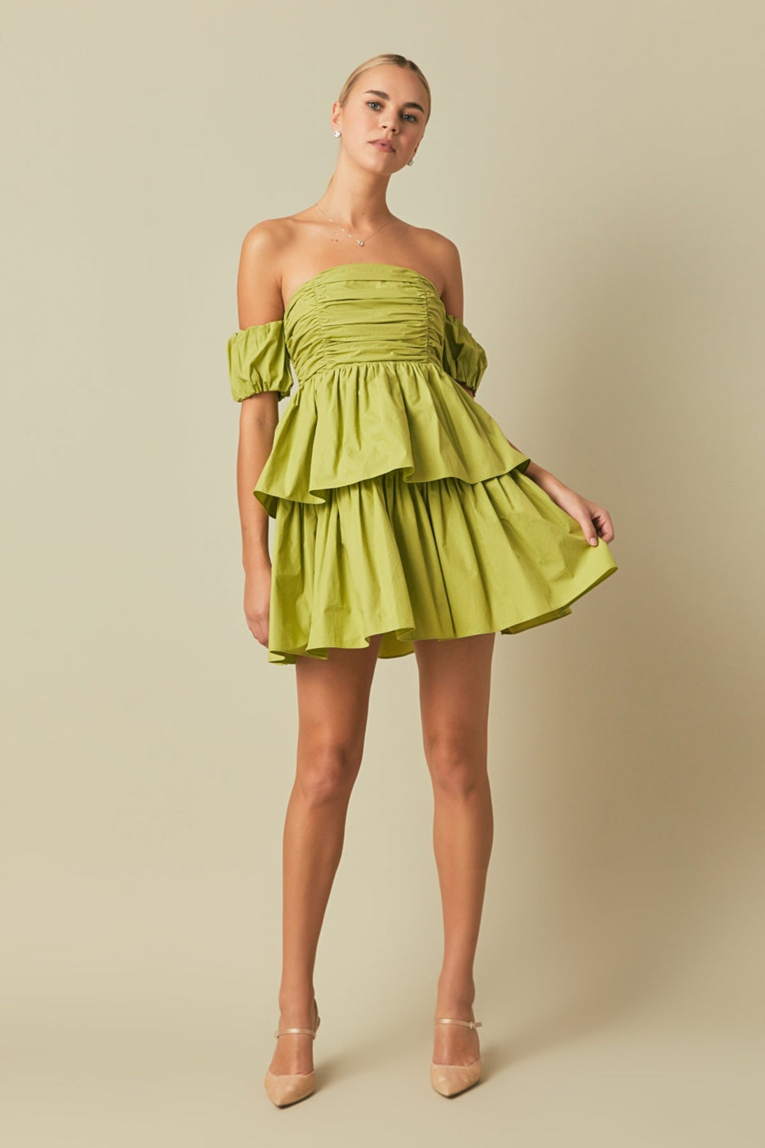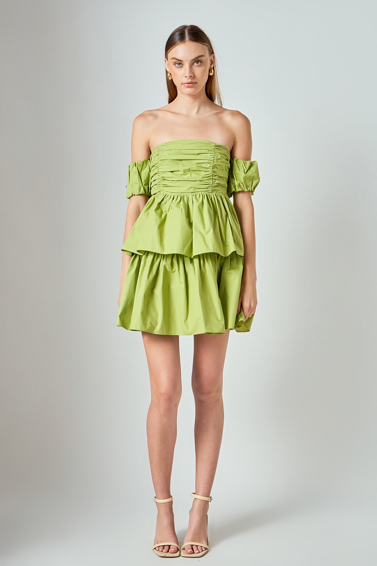 Get ready to turn heads with our stunning Ruched Off The Shoulder Mini Dress. This mini length dress features an alluring off the shoulder neckline that will showcase your shoulders and neckline beautifully. The ruched bust adds a touch of femininity and enhances your curves while the blouson sleeves add a chic and bohemian touch. Perfect for any occasion this dress is versatile and can be dressed up or down. Made with high-quality materials this dress will keep you comfortable and stylish all day long. Shop now and add this must-have dress to your wardrobe!