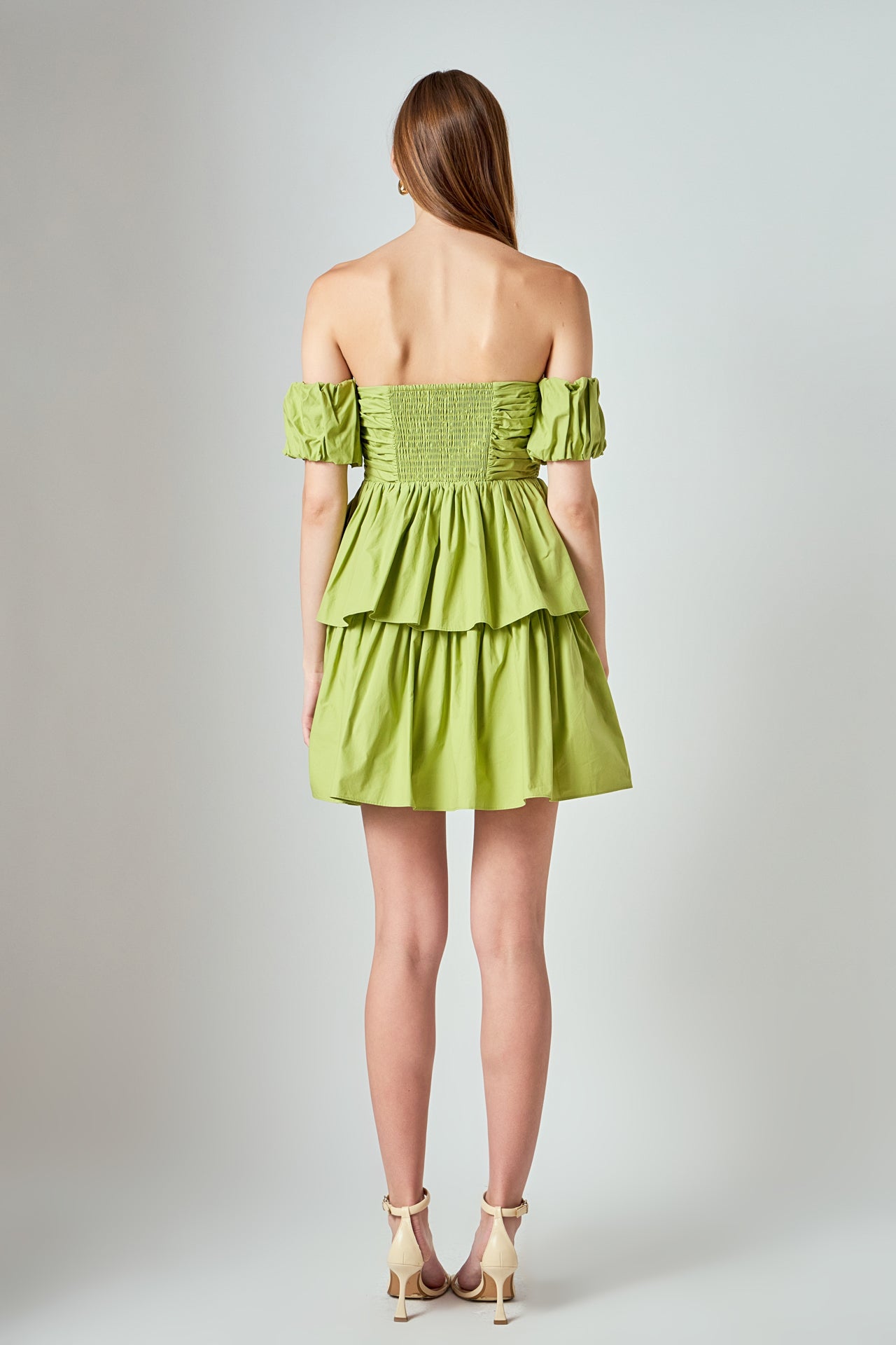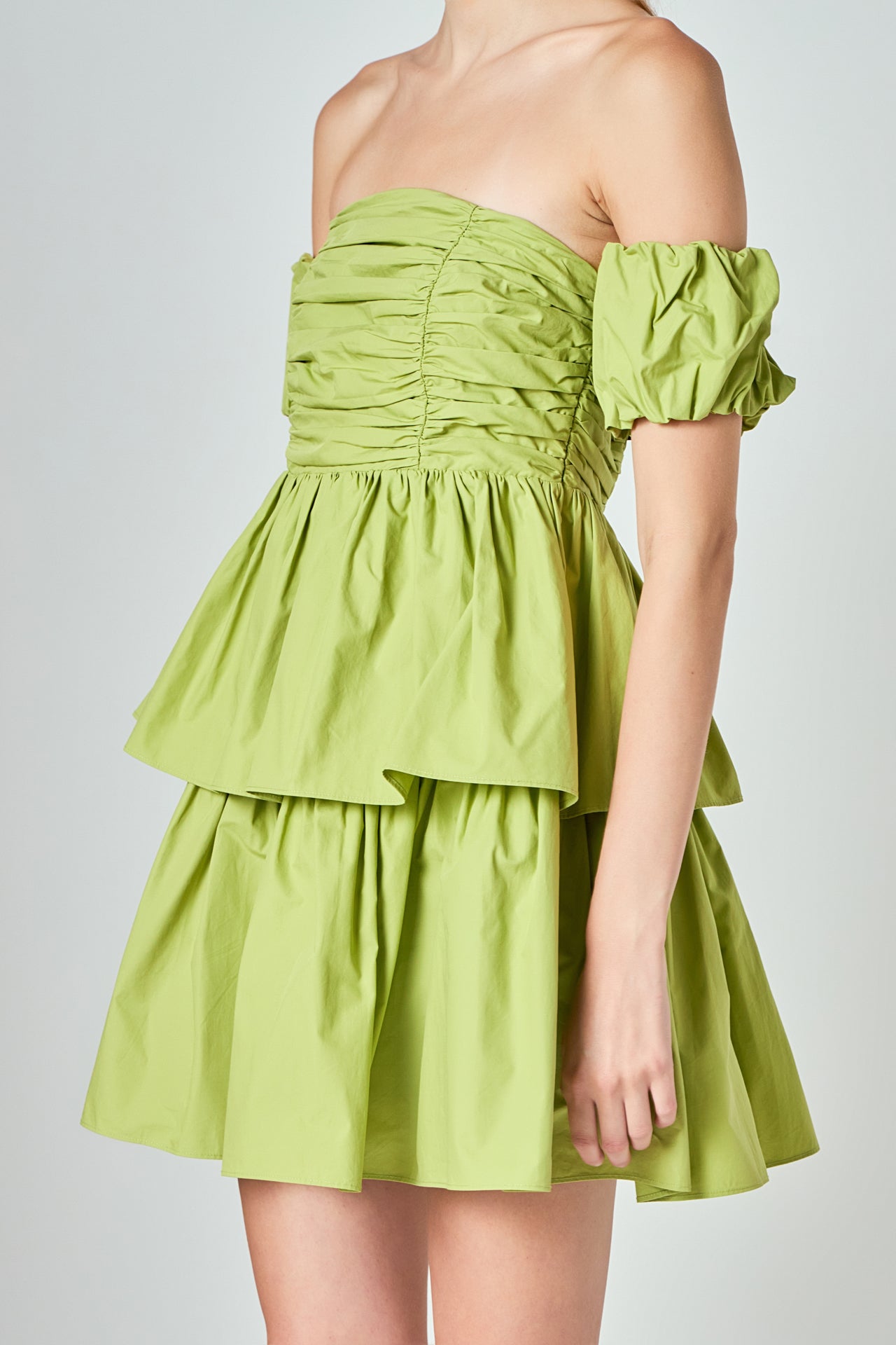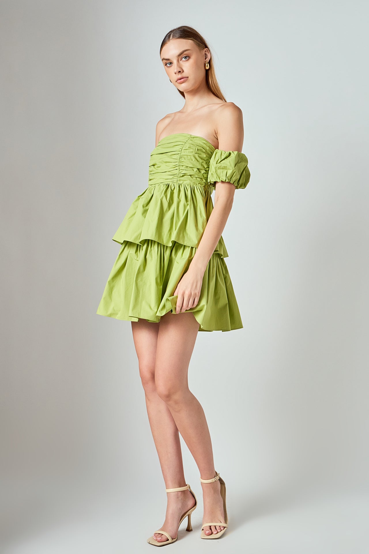 Get ready to turn heads with our stunning Ruched Off The Shoulder Mini Dress. This mini length dress features an alluring off the shoulder neckline that will showcase your shoulders and neckline beautifully. The ruched bust adds a touch of femininity and enhances your curves while the blouson sleeves add a chic and bohemian touch. Perfect for any occasion this dress is versatile and can be dressed up or down. Made with high-quality materials this dress will keep you comfortable and stylish all day long. Shop now and add this must-have dress to your wardrobe!