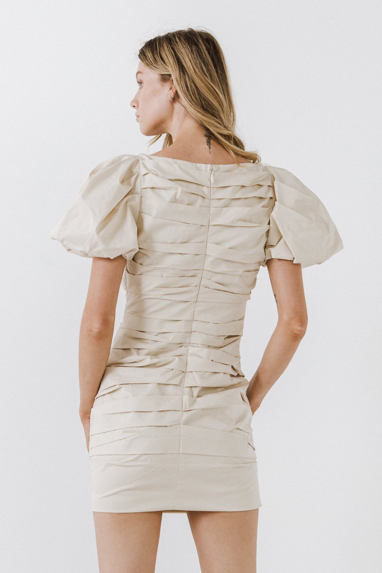 Make a statement with this breathtaking Ruched Puff Sleeve Dress. Featuring a ruched detail, short puff sleeves and mini length, this dress will turn heads wherever you go. Perfect for a night out, this dress is hand wash cold and offers you long lasting quality. Stand out above the rest in this unique ruched puff sleeve dress, sure to drive sales.