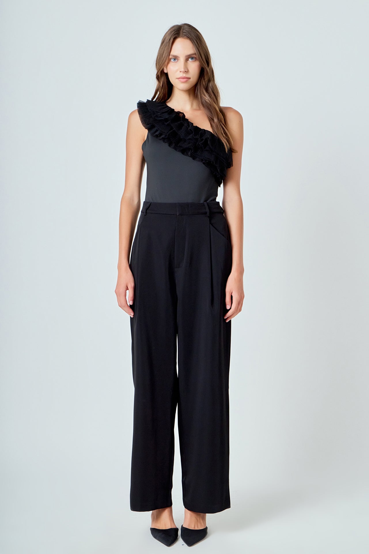 Take your style to the next level with this ruffled asymmetrical bodysuit. No need to worry about tucking or readjusting. This sleek fitted bodice has a striking asymmetrical shoulder and a delicate ruffled neckline for a touch of sophistication. It's the perfect way to add an unexpected twist to your wardrobe morning noon or night!