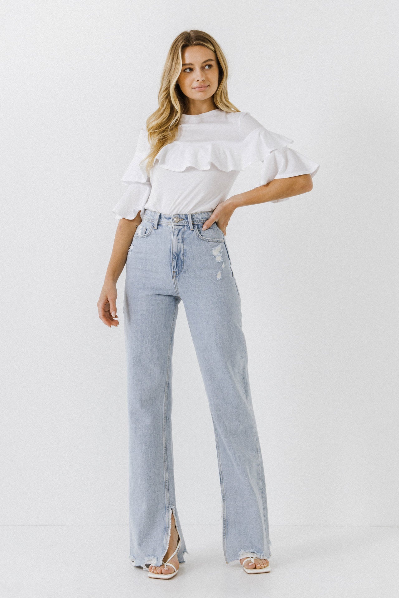 Our Ruffle Sleeve T-Shirt is a stylish, comfortable addition to your wardrobe. Features include a neck band, ruffle at the chest, and ruffle sleeves, making it a unique must-have. Perfect for casual days out or special occasions, its high-quality materials and construction make it a durable choice. Buy now and enjoy a signature look!