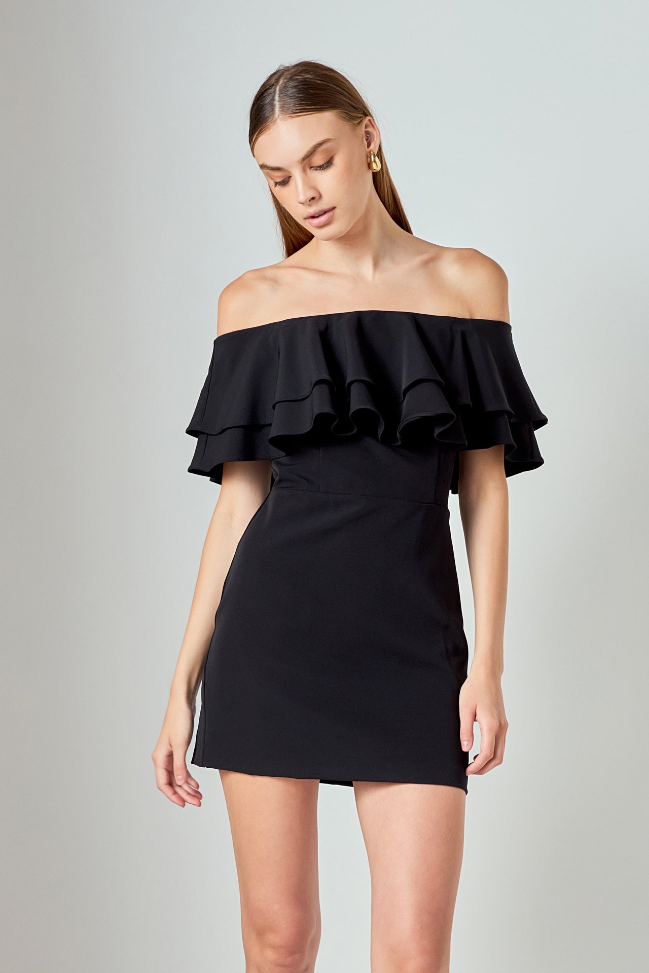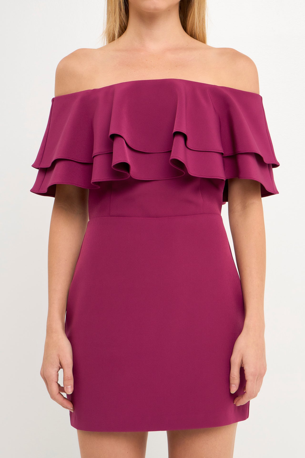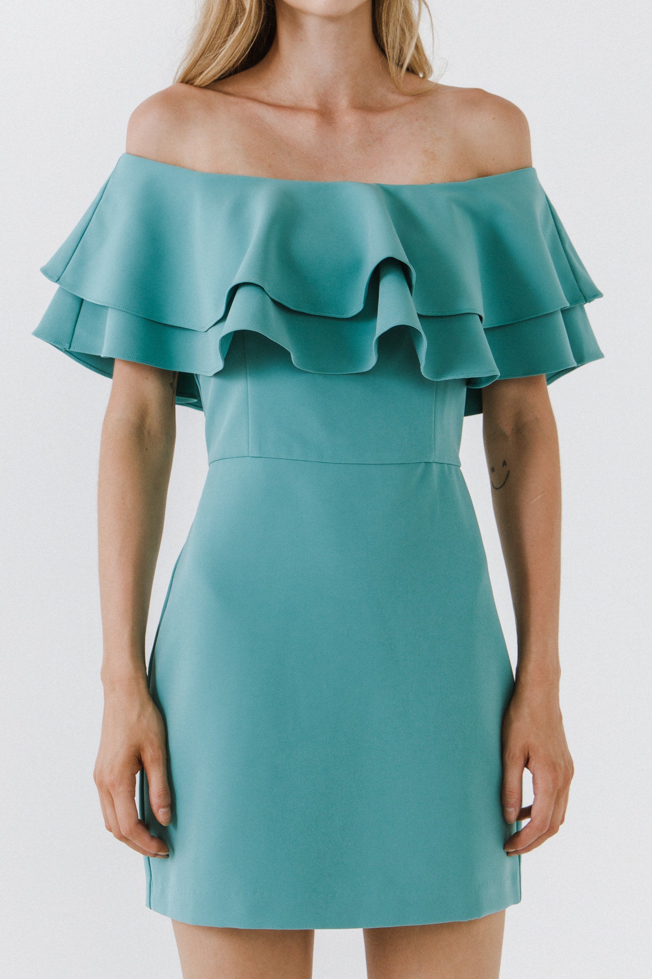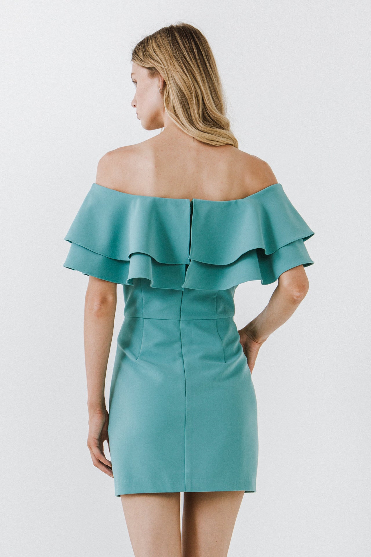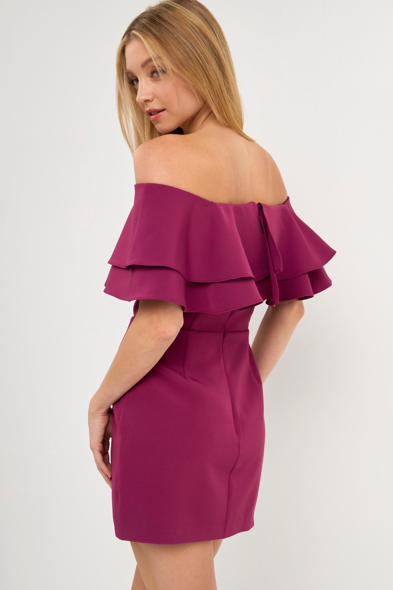 Feel confident and flirty in this ruffled off-shoulder mini dress. The perfect mix of sweet and sexy, this dress features 2 layers of ruffles along the neckline. The mini length is perfect for showing off your legs, while the center back zipper closure ensures a perfect fit. Whether you're headed to a party or a night out on the town, this dress is sure to turn heads.