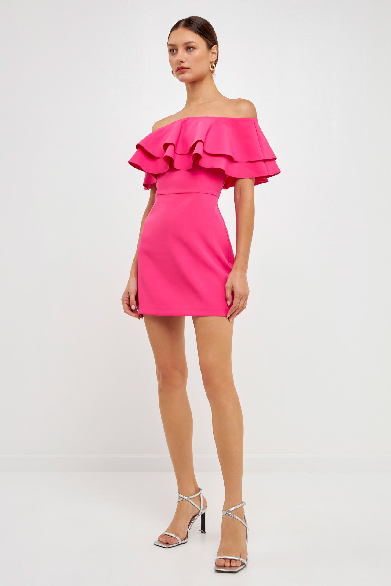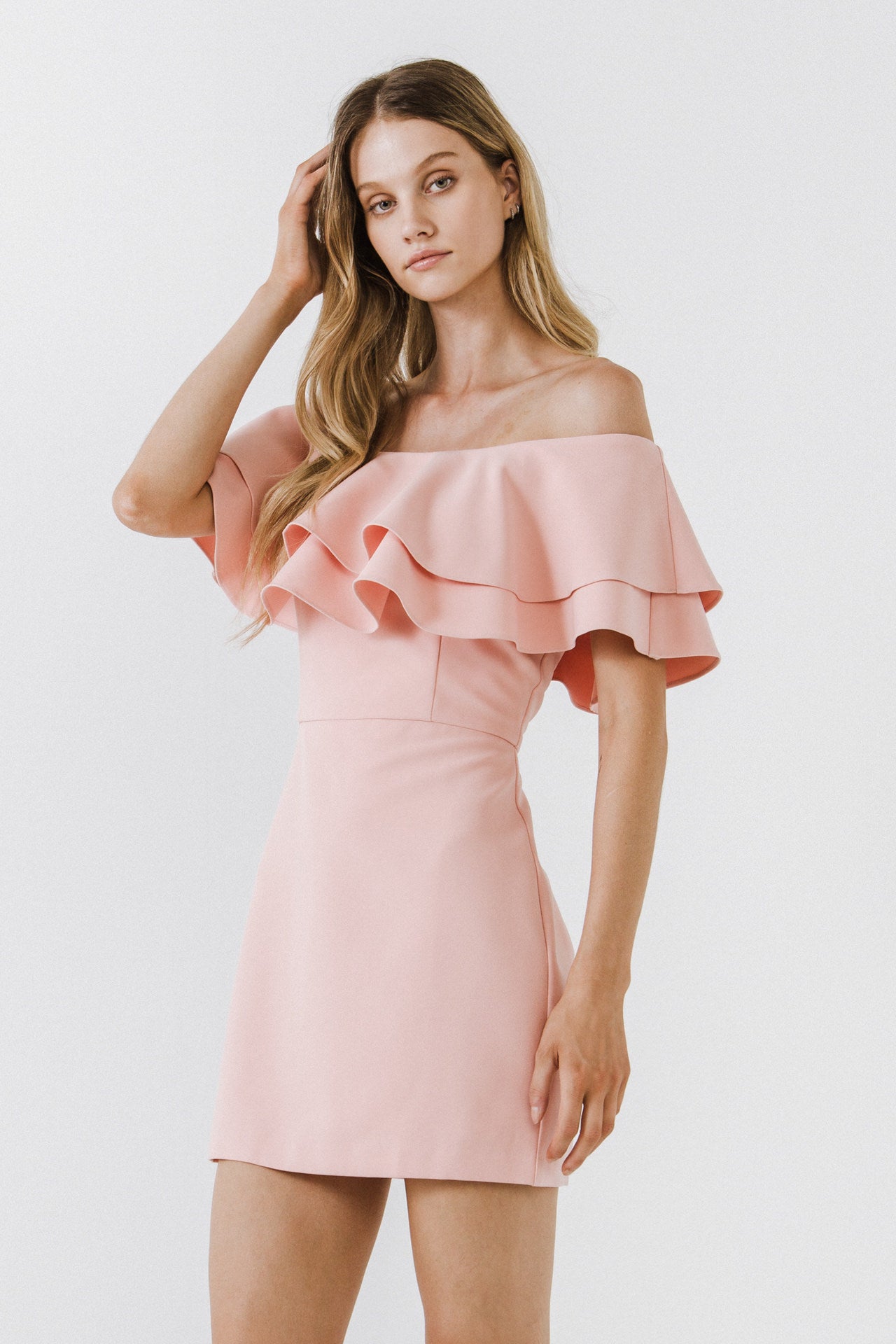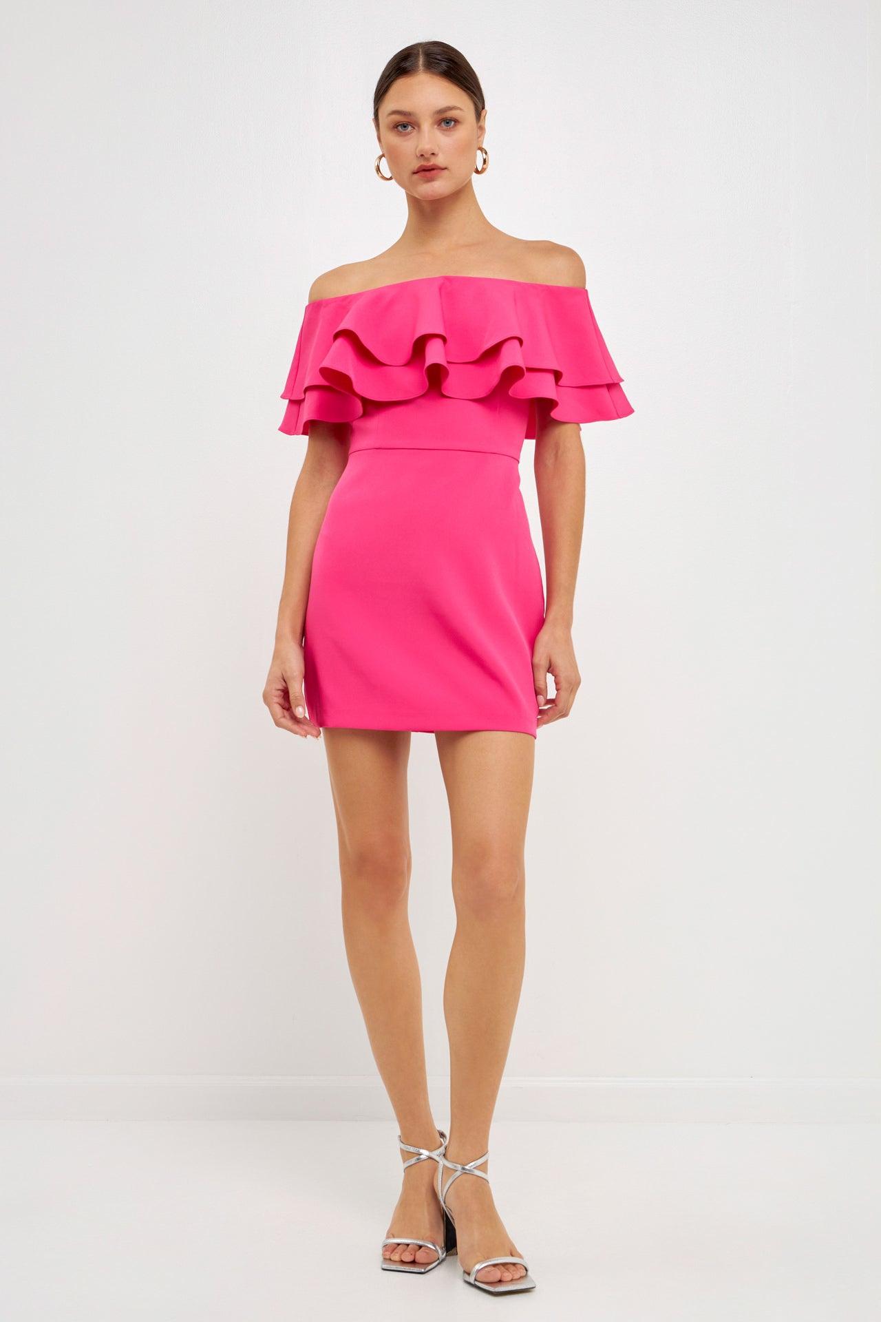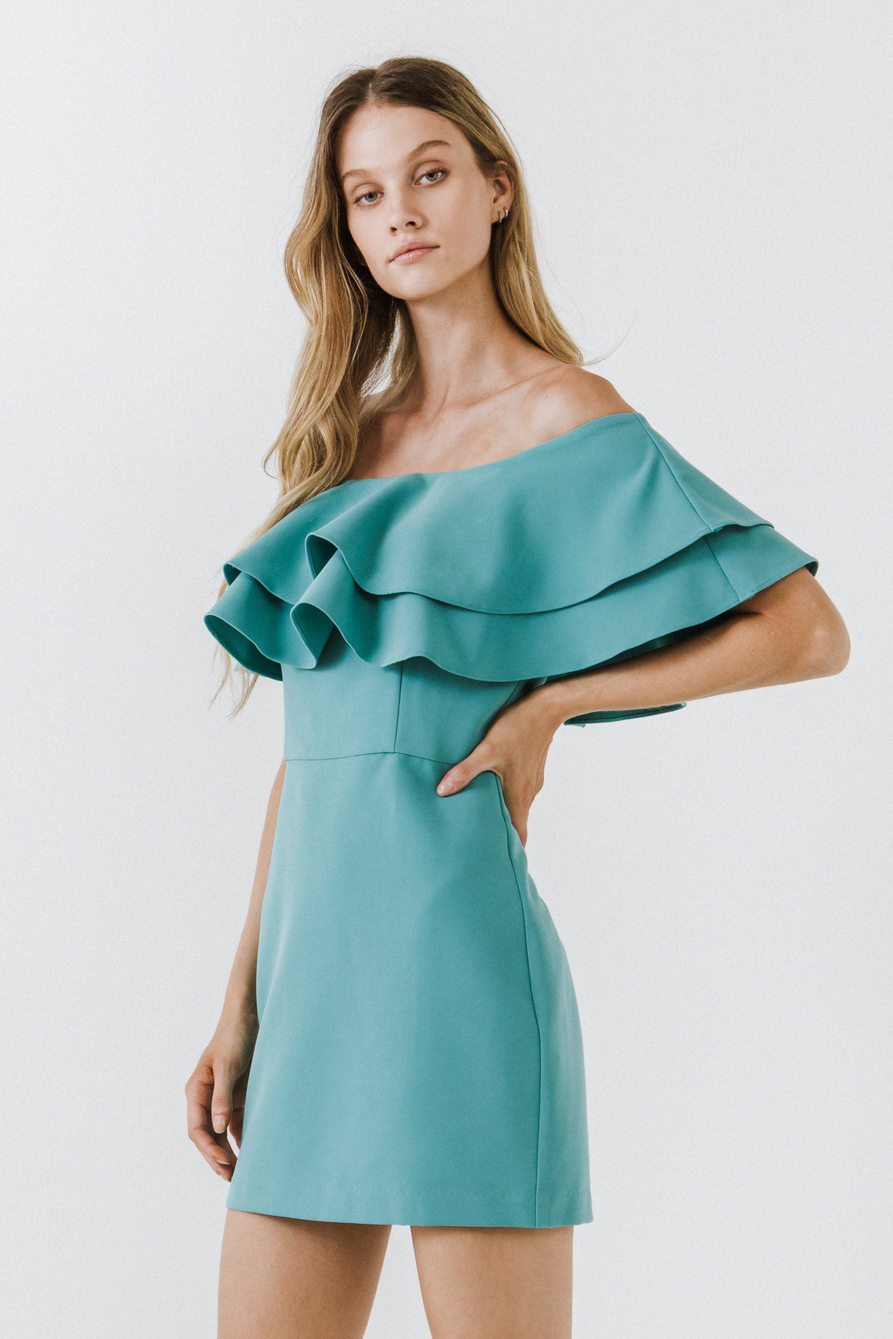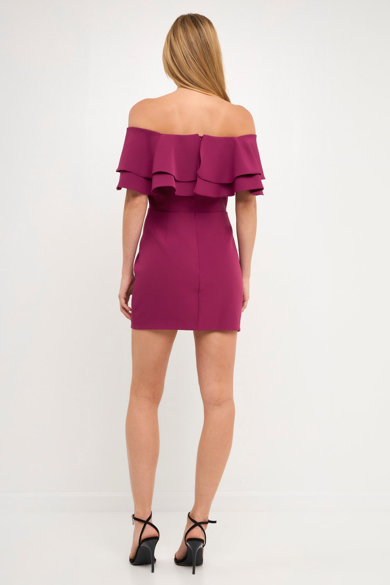 Feel confident and flirty in this ruffled off-shoulder mini dress. The perfect mix of sweet and sexy, this dress features 2 layers of ruffles along the neckline. The mini length is perfect for showing off your legs, while the center back zipper closure ensures a perfect fit. Whether you're headed to a party or a night out on the town, this dress is sure to turn heads.