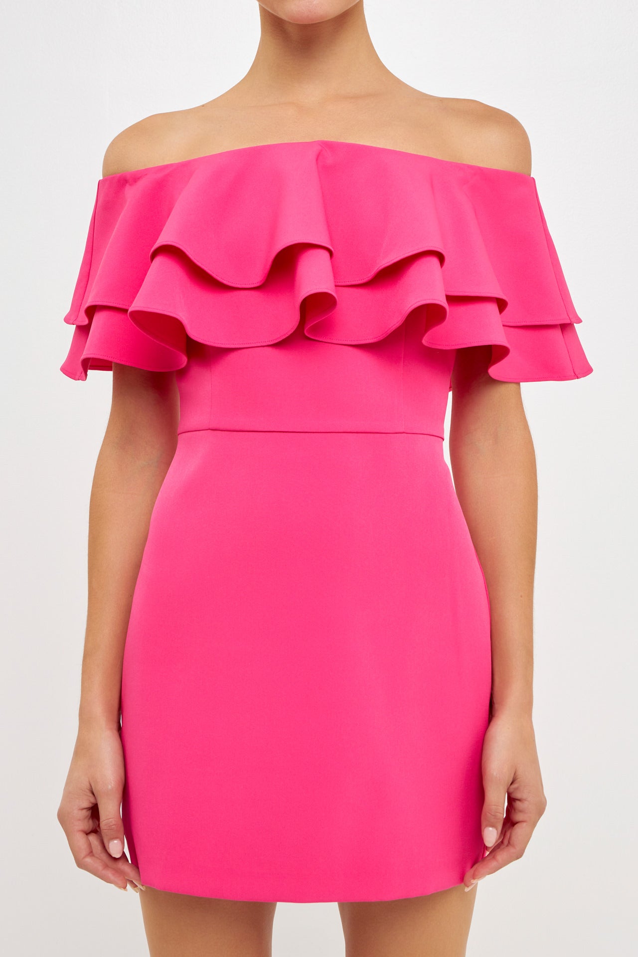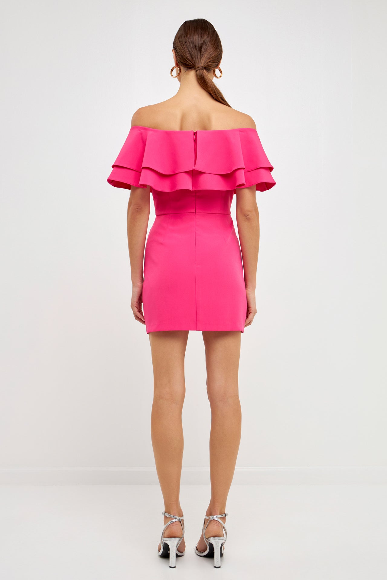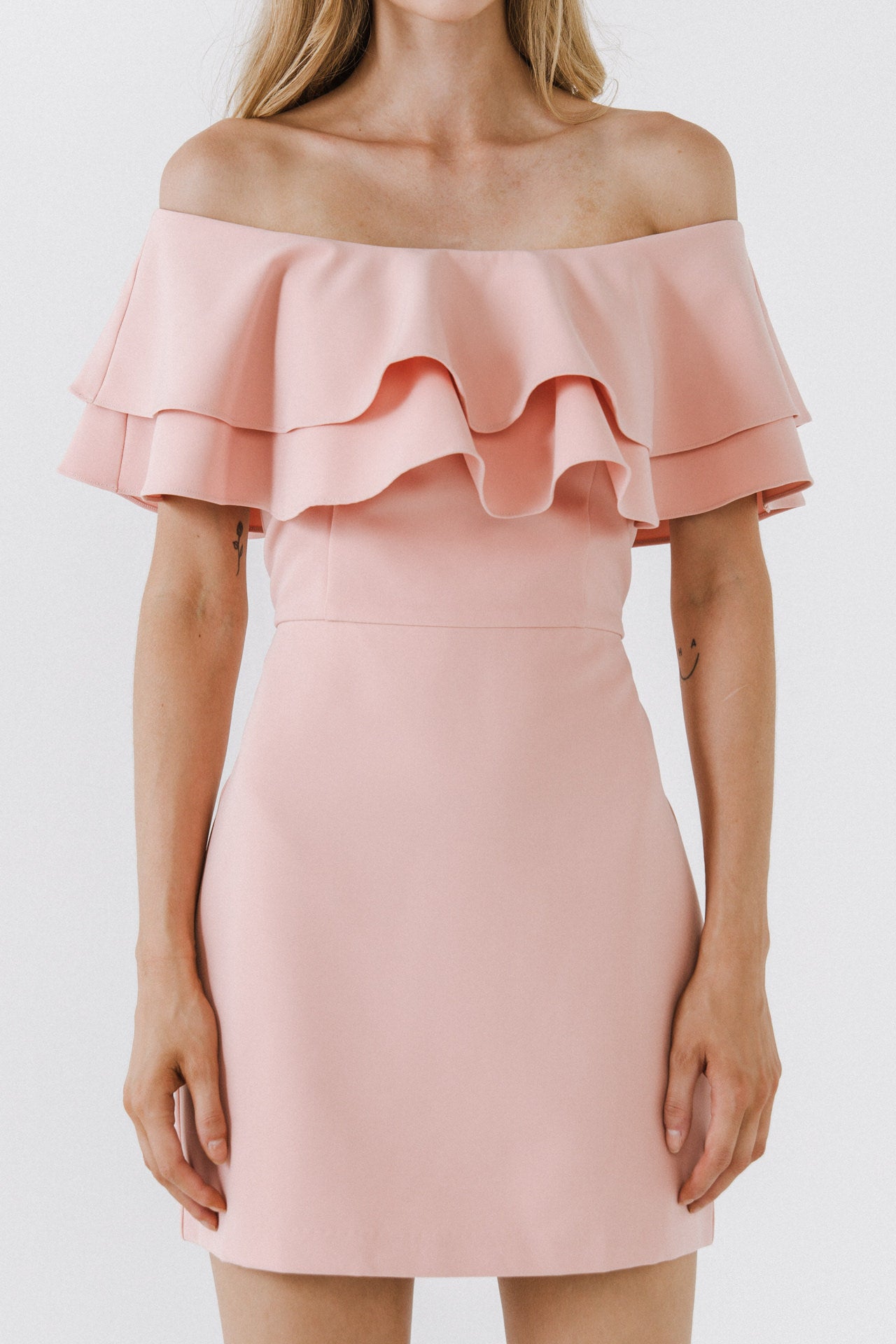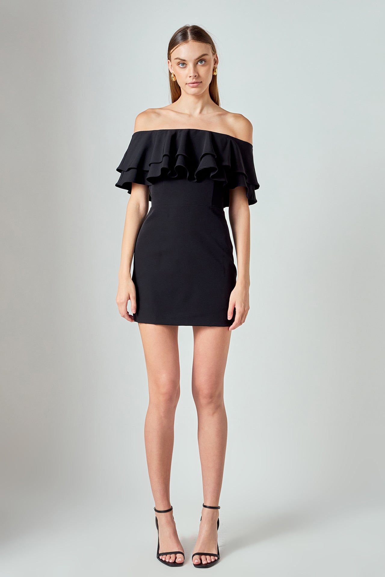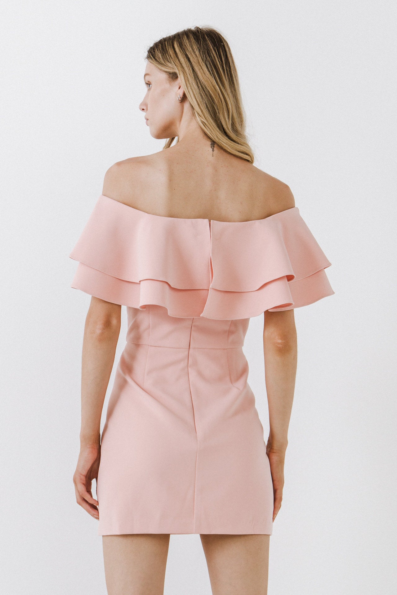 Feel confident and flirty in this ruffled off-shoulder mini dress. The perfect mix of sweet and sexy, this dress features 2 layers of ruffles along the neckline. The mini length is perfect for showing off your legs, while the center back zipper closure ensures a perfect fit. Whether you're headed to a party or a night out on the town, this dress is sure to turn heads.