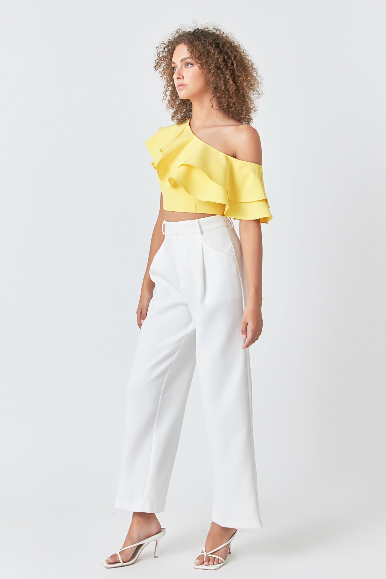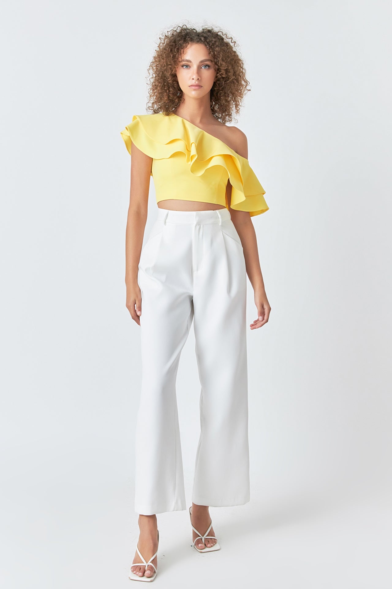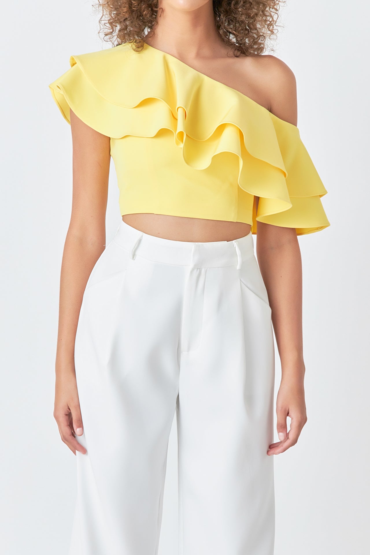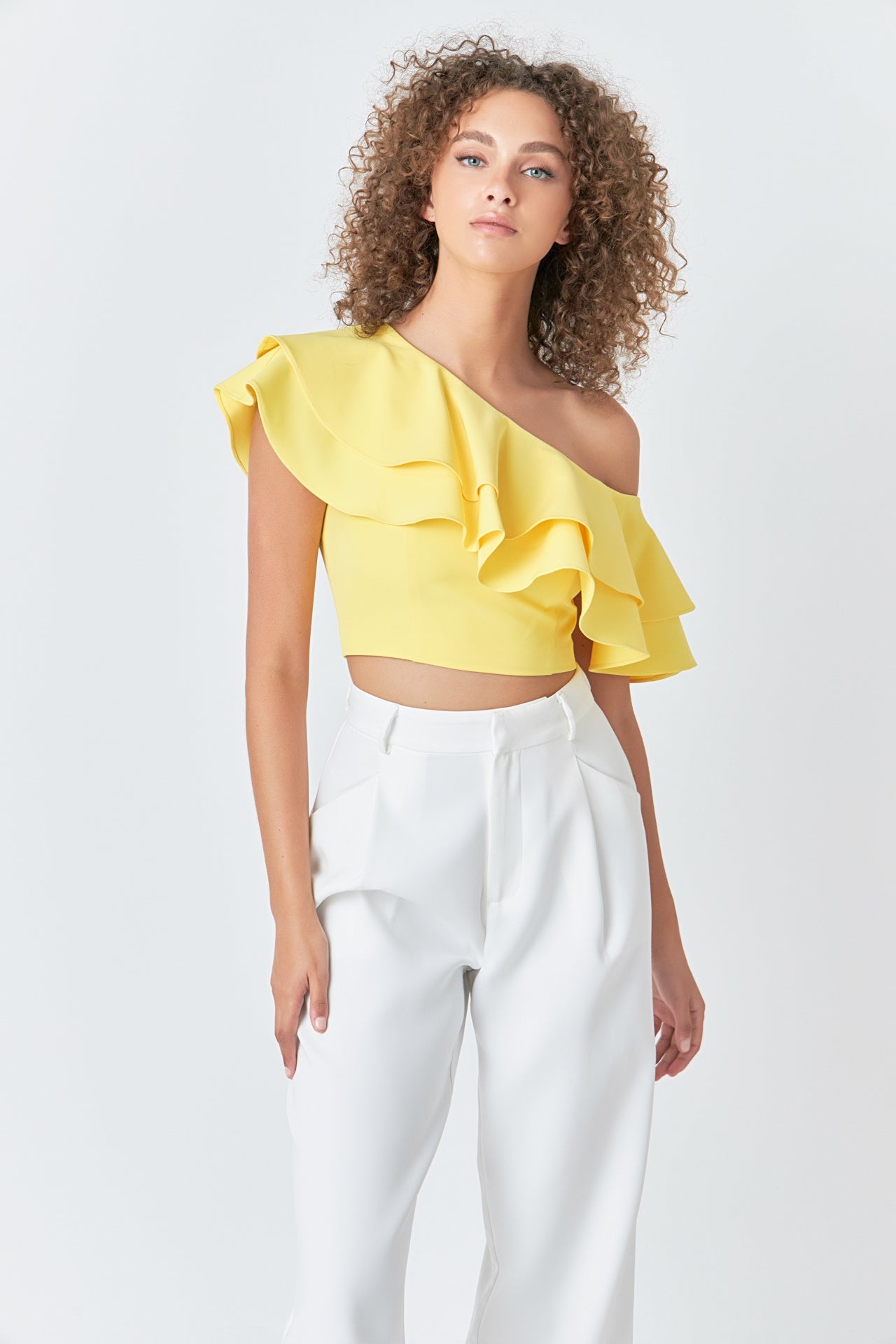 Add some drama to your outfit with this Ruffled One Shoulder Top. The one shouldered silhouette is unique and eye-catching, while the ruffle detail adds a touch of femininity. The crop length is perfect for showing off your best assets, while the invisible size zipper ensures a perfect fit. The top is lined for your comfort.