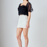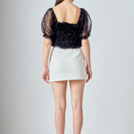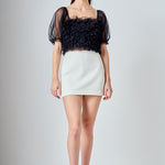This elegant Ruffled Puff Sleeve Tulle Top features a square neckline for a sophisticated look. Crafted with ruffled short puff sleeves this cropped length top will be sure to make any ensemble shine. Its airy silhouette makes this top perfect for any special occasion.