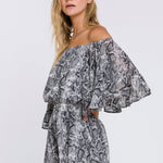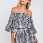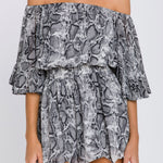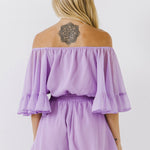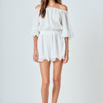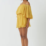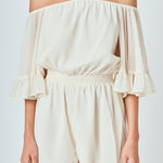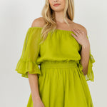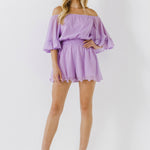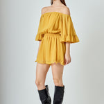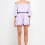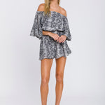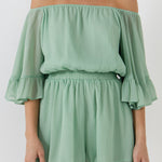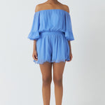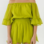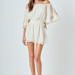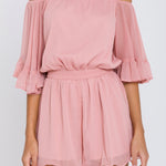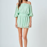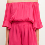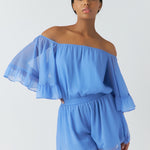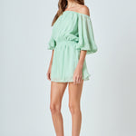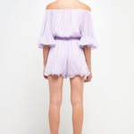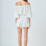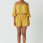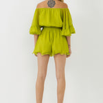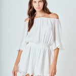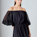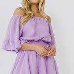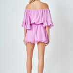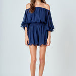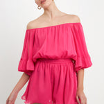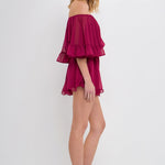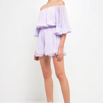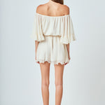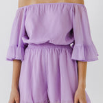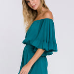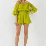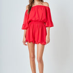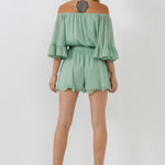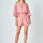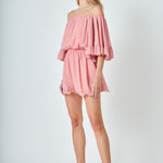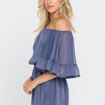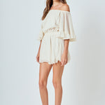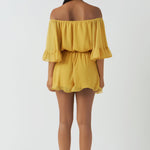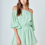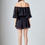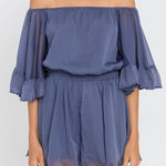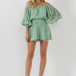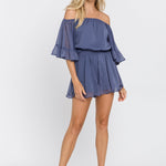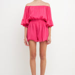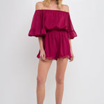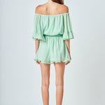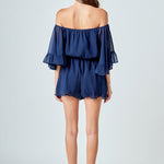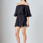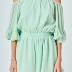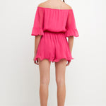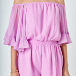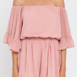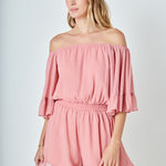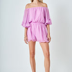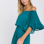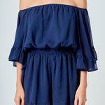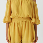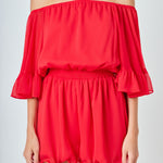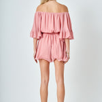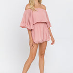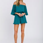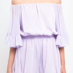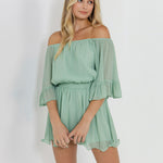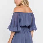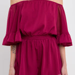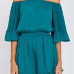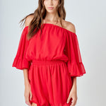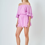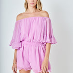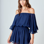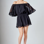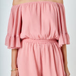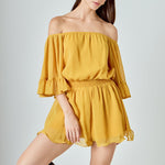 This ruffled sleeve romper is perfect for a day of fun in the sun. The off-the-shoulder silhouette and ruffle sleeves add a touch of femininity to this casual piece. The elastic at the waist ensures a comfortable and flattering fit. Made from a solid chiffon fabrication this romper is sure to become your new go-to piece for any casual occasion.