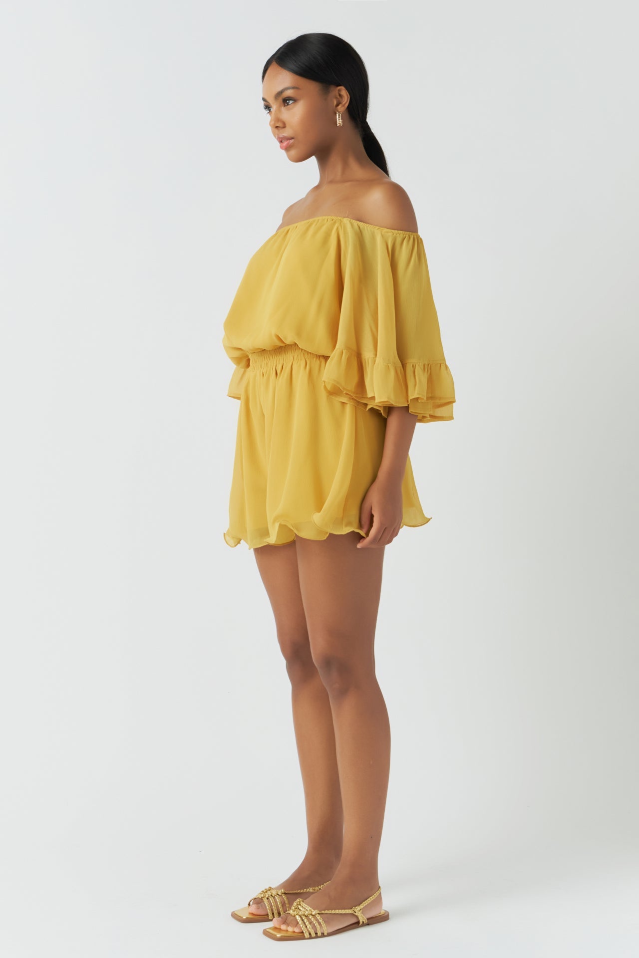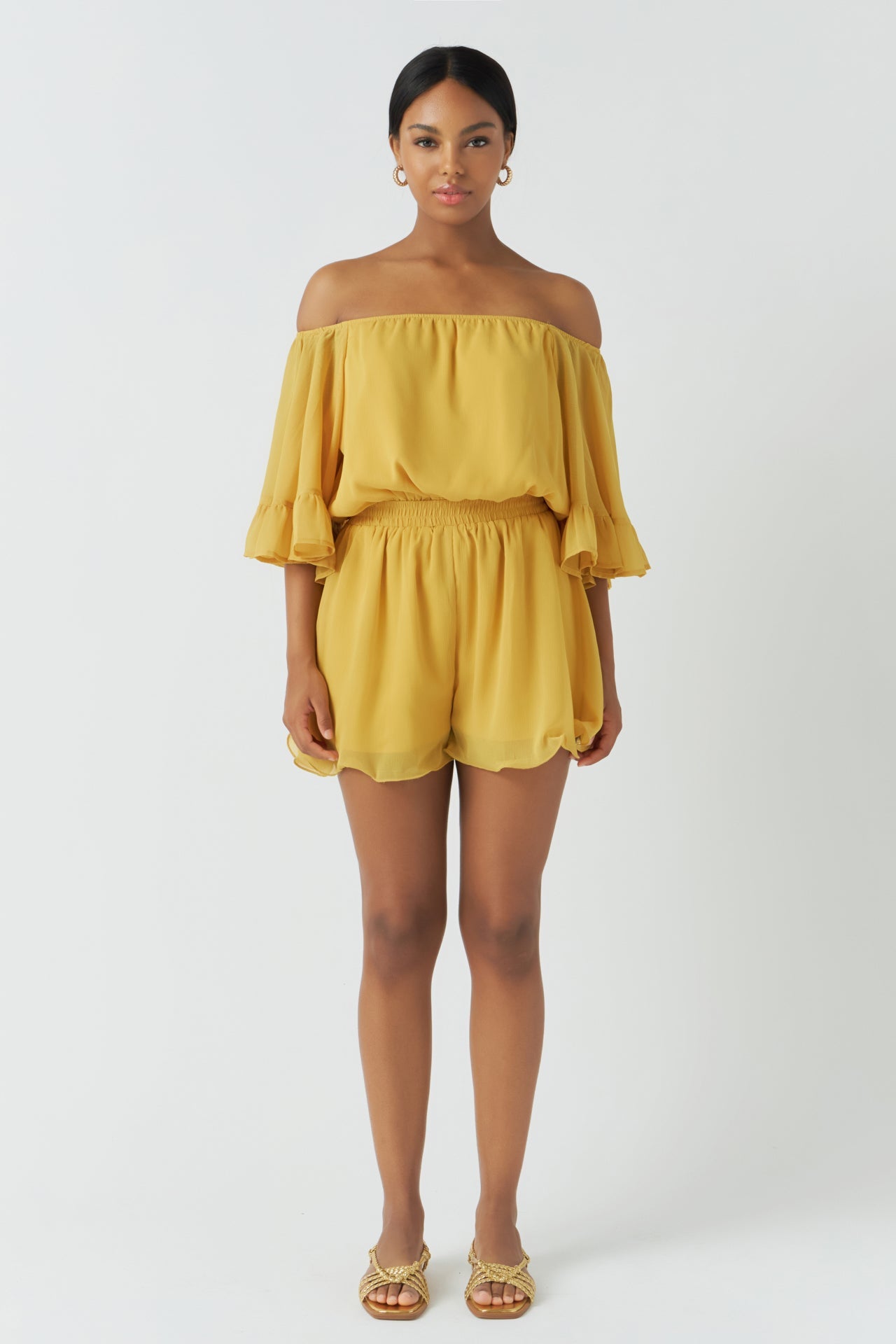 This ruffled sleeve romper is perfect for a day of fun in the sun. The off-the-shoulder silhouette and ruffle sleeves add a touch of femininity to this casual piece. The elastic at the waist ensures a comfortable and flattering fit. Made from a solid chiffon fabrication this romper is sure to become your new go-to piece for any casual occasion.