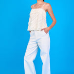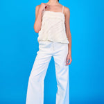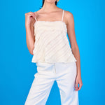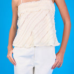Be the epitome of elegance in our Ruffled Sleeveless Top. Crafted with pleated chiffon and delicate ruffles this top will elevate any outfit. The regular length provides the perfect balance between style and comfort while the side zipper ensures a snug fit. Adjust the straps to your liking for a personalized touch. Perfect for any occasion this top will enhance your feminine charm. Your search for the perfect top ends here. Grab yours now and make a statement with our Ruffled Sleeveless Top.