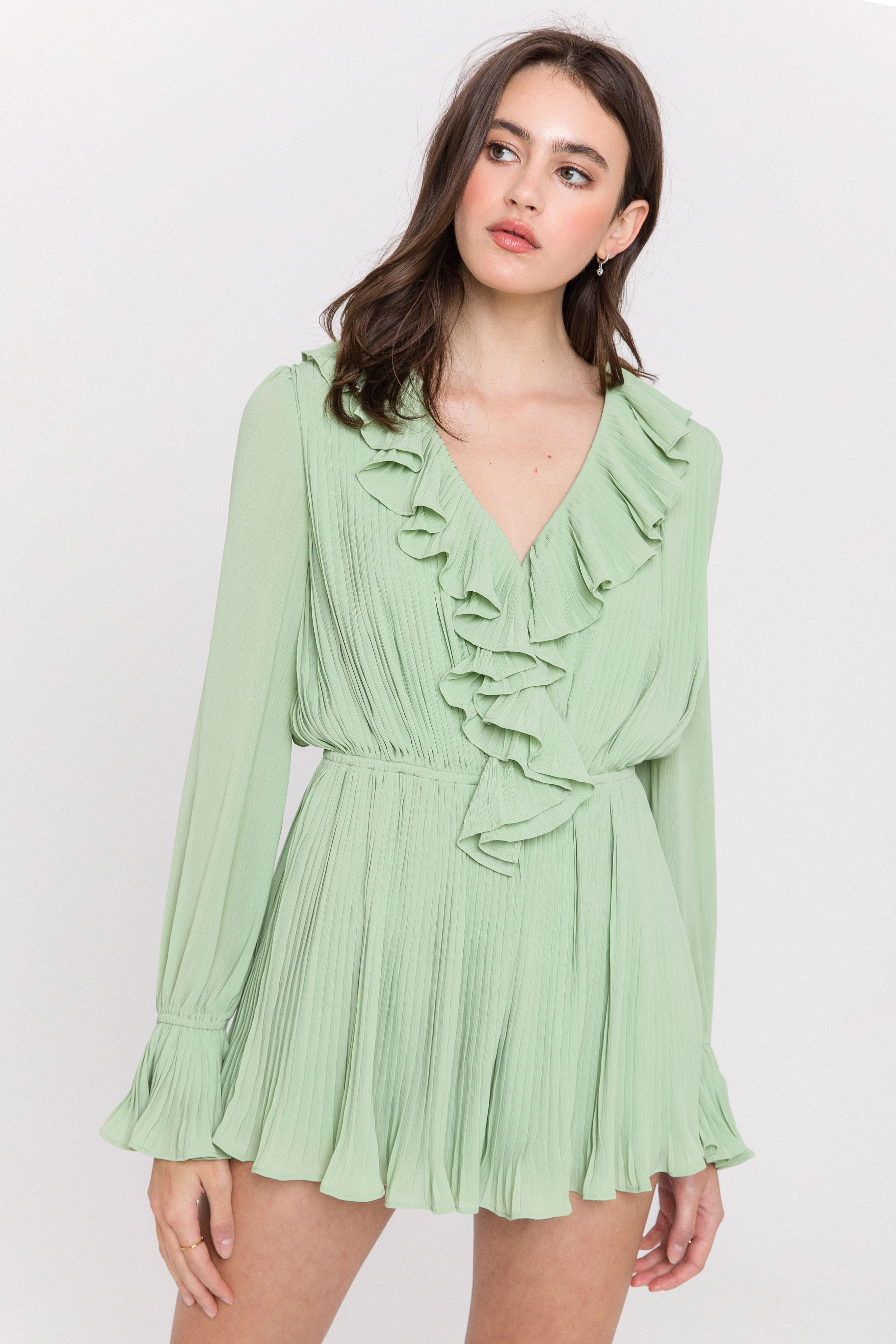 Dress up in style with our Ruffled V-neck Romper. This trendy romper features a pleated ruffle at the neck line for a touch of feminine flair, along with long sleeves to keep you stylishly covered. With elastic at the sleeves and waist, this romper offers a flattering and comfortable fit. The pleated detailing at the body adds texture and dimension to this must-have romper. Perfect for any occasion, this romper will have you looking effortlessly chic. Shop now and make a statement with our Ruffled V-neck Romper that will surely turn heads.
