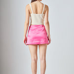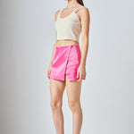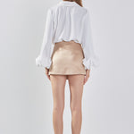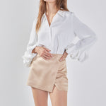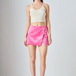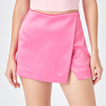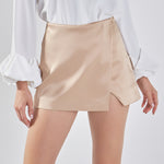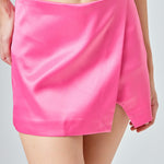 Upgrade your wardrobe with our Satin Asymmetric Skort. Made from luxurious stretch satin it offers both comfort and style. The midi rise and mini length create a flattering silhouette while the front wrap style adds a touch of sophistication. Perfect for any occasion whether it's a night out or a day at the office. Get ready to turn heads and make a statement with our unique skort. Elevate your look and stand out from the crowd. Shop now and experience the ultimate combination of comfort and fashion.