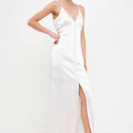 This elegant and flowing maxi dress is perfect for any formal occasion. The luxurious satin fabric drapes beautifully and the front cover button detail adds a touch of sophistication. The shirred bust, adjustable spaghetti straps and back V drop are both flattering and comfortable. The cinched waist provides a figure-hugging silhouette and the front slit adds a touch of sexiness. You'll look and feel amazing in this gorgeous dress.