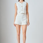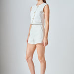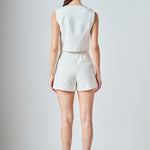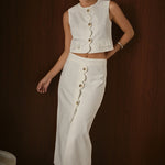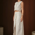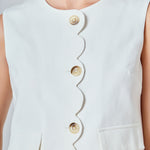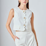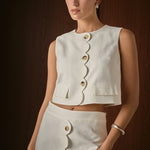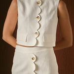 Introducing our newest summer staple, the Catherine Scallop Edge Cropped Linen Vest. Made from airy, breathable linen, this vest is perfect for keeping you cool during those sun-soaked days. It's finished with delicate scalloped edges and a cropped silhouette that pairs effortlessly with high-waisted skirts, denim, or trousers. Equal parts polished and playful, it's the piece that transitions seamlessly from brunch to breezy evenings. Consider it your shortcut to effortless summer chic.