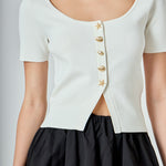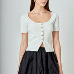 Effortless and feminine, the Scoop Neck Cropped Knit Top brings a fresh twist to everyday knitwear. Its flattering cropped silhouette and soft scoop neckline are accented with delicate shell-shaped buttons, adding a playful detail. Crafted from a lightweight knit, it's perfect for layering or wearing solo, transitioning seamlessly between seasons. Pair it with denim for casual charm or a mini skirt for a more feminine look. this is the versatile staple that makes everyday dressing feel intentional.