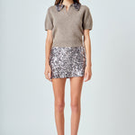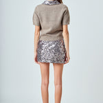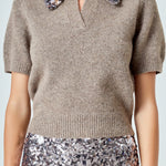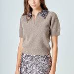The Sequin Accent Collar Knit Sweater Top proves that everyday staples can still shine. Crafted from a soft, breathable knit that drapes with ease, it's finished with a delicately sequined collar, adding just the right touch of subtle sparkle. Equal parts cozy and refined, it pairs effortlessly with tailored trousers for a polished office look or denim for weekend ease. A timeless essential, reimagined with a hint of glamour.