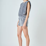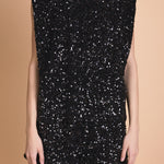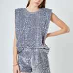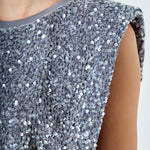 Enhance your glamourous wardrobe with our Sequin Embellished Top. Made from stretchy velvet sequin fabric, this top offers a perfect, figure-hugging fit. The ribbed round neck adds a touch of sophistication, while the shoulder pads provide a structured silhouette. The sleeveless design adds a touch of femininity. Pair it with jeans for a casual look or dress it up with a mini skirt for a night out. Make a statement and sparkle with our unique sequin top. Perfect for any occasion, this top will make you stand out in a crowd. Shop now and add some glam to your closet.