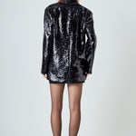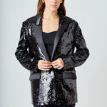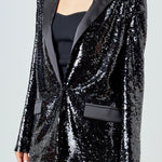 This Sequin Oversized Jacket is a chic addition to your wardrobe. Featuring a taffeta peaked lapel and V neckline this jacket is sparkly and eye-catching with its sequin embellishments. The long sleeves make it a perfect option for a night out or special occasion. This statement piece is sure to make you stand out. Enhance your style and make a statement with this Sequin Oversized Jacket!