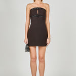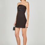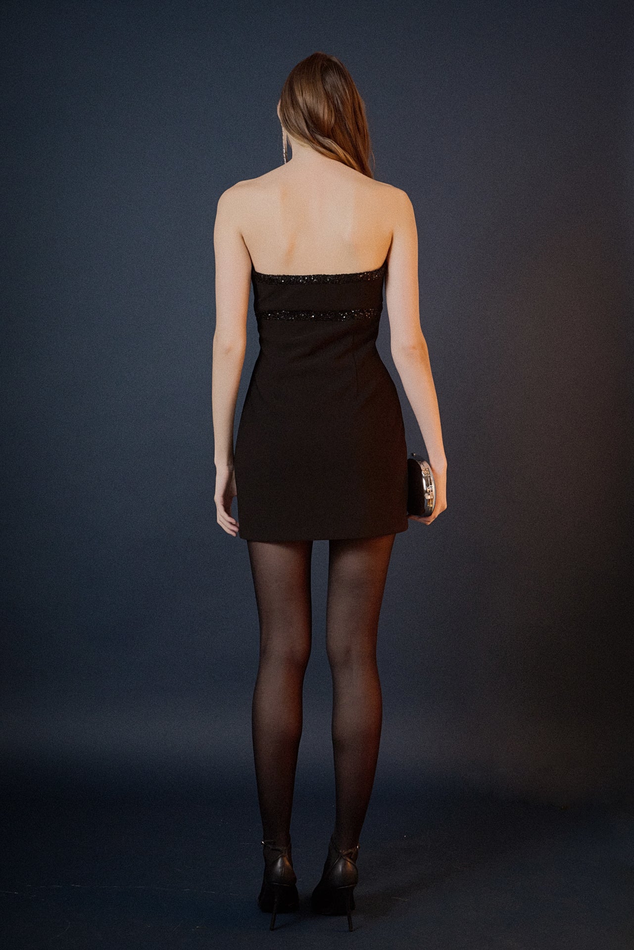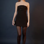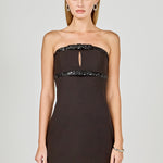 Shimmer from every angle in our Sequin-Trim Strapless Mini Dress. Featuring a strapless silhouette with delicate bow accents, this dress perfectly balances feminine charm and modern style. The mini length and fitted cut flatter your curves, while the side zipper ensures a seamless, secure fit. Effortlessly versatile, it can be dressed up with heels and statement jewelry or styled casually with sneakers and a denim jacket.
