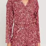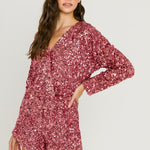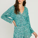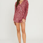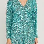 Look stunning in this Sequin Wrap Romper. It features beautiful sequin fabric, long Dolman sleeves, wrap style with a snap button at the front for closure. Perfect for a dressy occasion, this romper is sure to have heads turning. Show off your unique style and standout with this show-stopping piece. Get ready to sparkle!