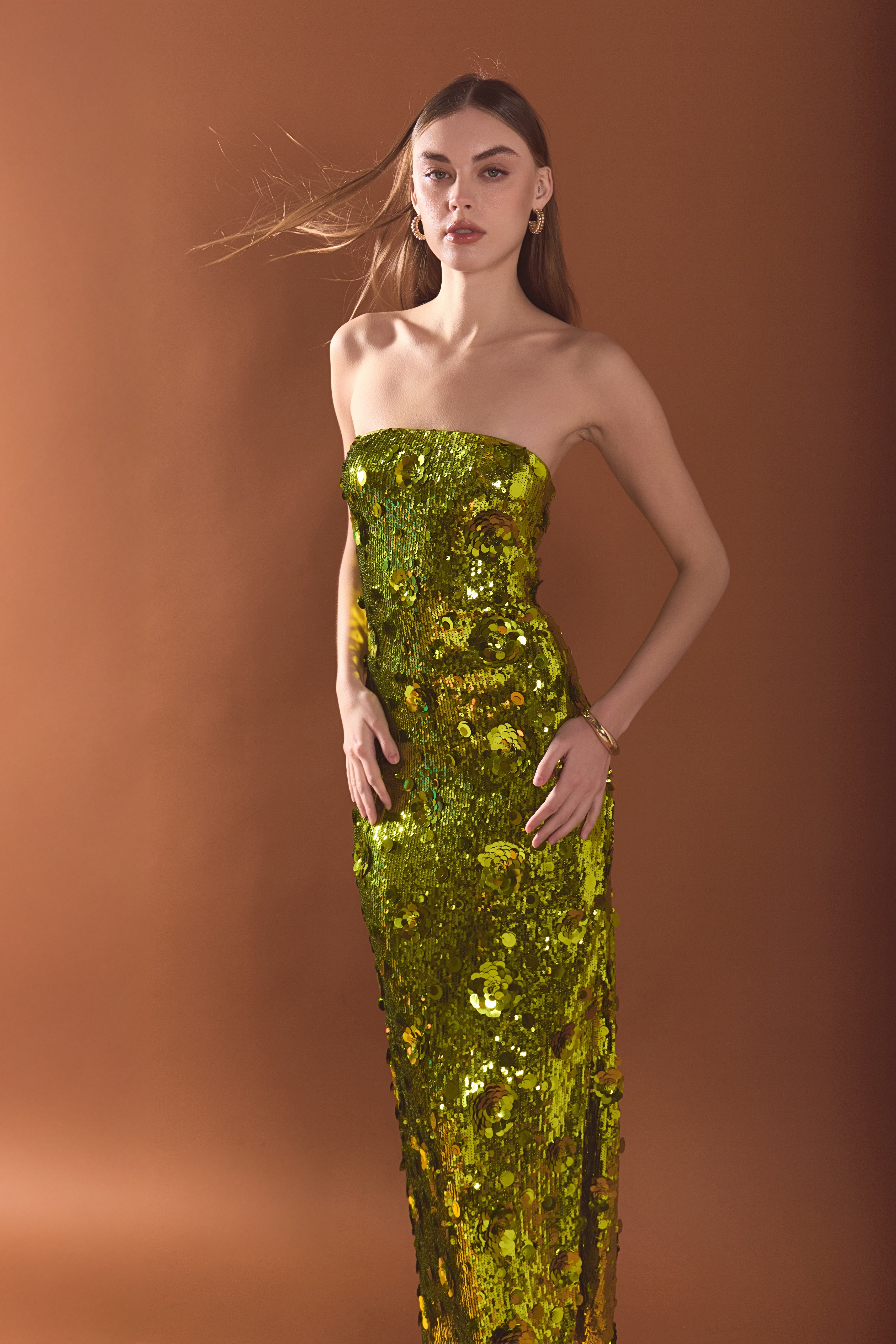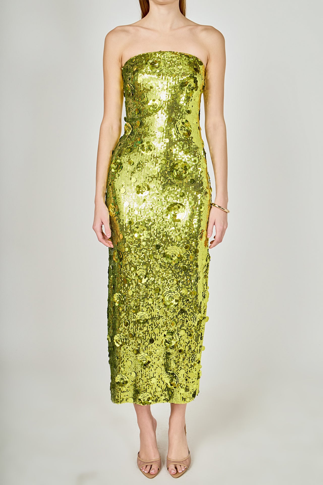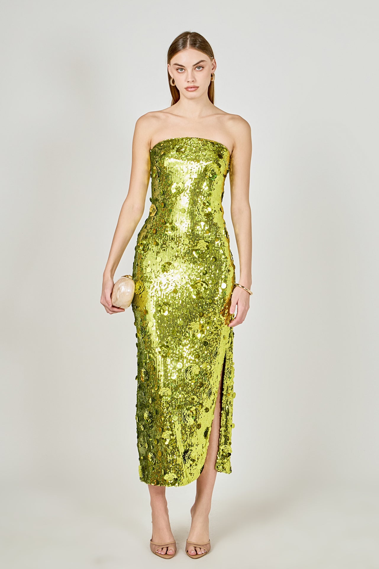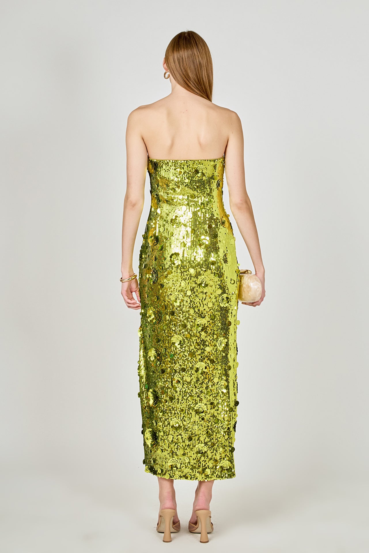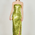 Dazzle the night away in our Sequins Applique Midi Dress. This stunning strapless dress is the perfect addition to your party wardrobe. The midi length offers a sophisticated touch while the side zipper ensures a sleek and comfortable fit. The sequin applique adds just the right amount of sparkle to make you stand out from the crowd. Perfect for any occasion, this dress will have you feeling confident and glamorous.