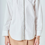 Crafted from airy, lightweight cotton, this button-up shirt offers a perfect balance of comfort and polish. Designed with a slightly oversized fit, it drapes effortlessly on the body for a relaxed yet refined silhouette. The standout detail is the placket, intricately adorned with shimmering sequins and delicate beadwork, adding a subtle touch of glamour to this classic piece. Easy to style and endlessly versatile, this shirt can be worn tucked into tailored trousers for an elevated look or left loose over denim for a chic, effortless vibe. A wardrobe essential with a sophisticated twist.