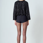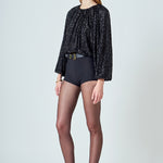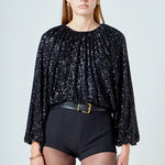 The blouson top is a classic style that is always in fashion. With a flattering cropped bodice and a lightweight feel, this blouse is sure to become your go-to top. The sequins add a touch of sparkle and shine. Pair this top with a denim skirt for a fun, casual look, or dress it up with some black trousers and heels for a night out.