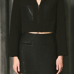 Introducing our Sequins Combo Jacket, the perfect combination of style and functionality. Featuring a front zipper for easy wear, the jacket also boasts front pockets for convenience and a chic V neckline that elongates the silhouette. Made with high-quality materials, the jacket is designed with a stylish collar and lapel for a touch of elegance. Sparkle and shine in this eye-catching jacket, perfect for any occasion. Stand out from the crowd with this must-have piece in your wardrobe. Grab yours now and upgrade your outfit game!