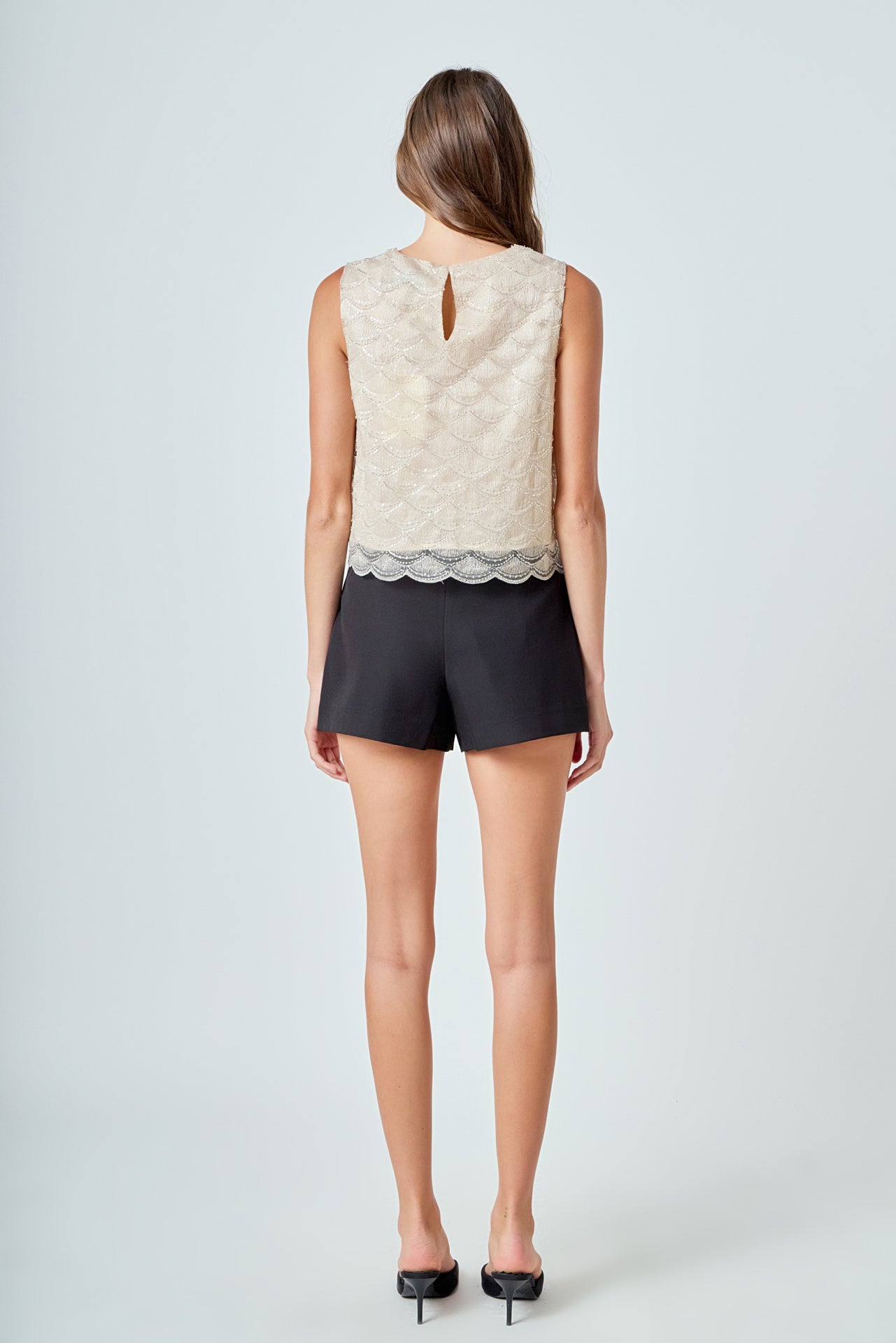 Add some sparkle to your wardrobe with our Sequins Embellished Top. This top is anything but ordinary, featuring eye-catching sequin embellishments that are sure to turn heads. The sleeveless cut and classic round neckline offer versatile styling for any occasion, while the back keyhole closure ensures effortless dressing and removal. Stand out from the crowd and make a statement with this must-have top. Perfect for parties, date nights or a night out with friends. Made from high-quality materials, this top is both comfortable and stylish. Elevate your style with this sequin stunner.