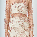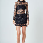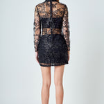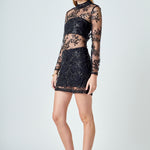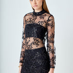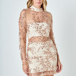 This stunning mini dress is a perfect choice for spicing up any party look! The dress is crafted from a lightweight fabric that is printed with delicate sequins embroidery and features a mini length fitted cut and mock neck. The unique sequin print design adds a sparkle to any occasion making this dress the perfect statement piece. Our sequins embroidered mini dress is sure to make heads turn - don't miss out on your chance to shine!