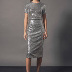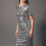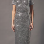 Our stunning Sequins Short Sleeve Maxi Dress will make you turn heads! This dress offers a glamorous sequin-covered fabric that glistens and sparkles as you move. The maxi dress is designed with a round neckline short sleeves and maxi length for an elegant silhouette.