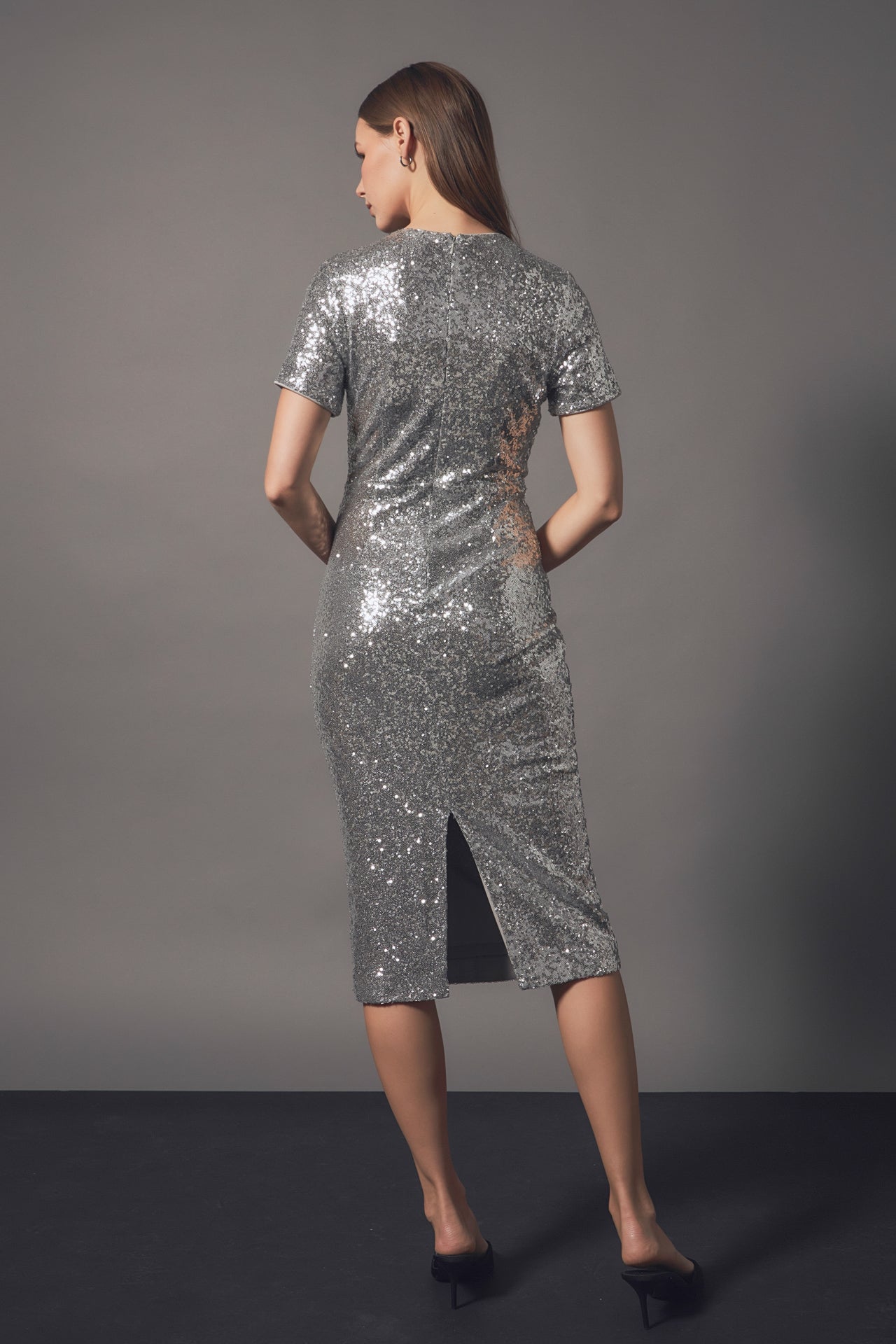 Our stunning Sequins Short Sleeve Maxi Dress will make you turn heads! This dress offers a glamorous sequin-covered fabric that glistens and sparkles as you move. The maxi dress is designed with a round neckline short sleeves and maxi length for an elegant silhouette.