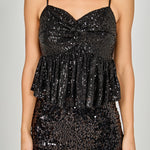 The Sequin Tank Top features feminine design details like a peplum silhouette and twisted bust knot. Plus, the adjustable spaghetti straps and side zipper allow you to ensure a snug and proper fit. The beautiful mini sequins add flair to any outfit and ensure you light up every room you walk into.