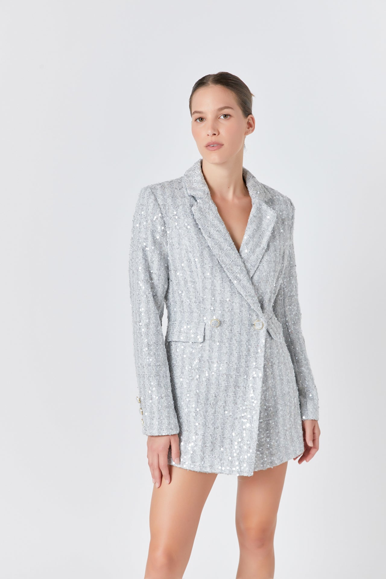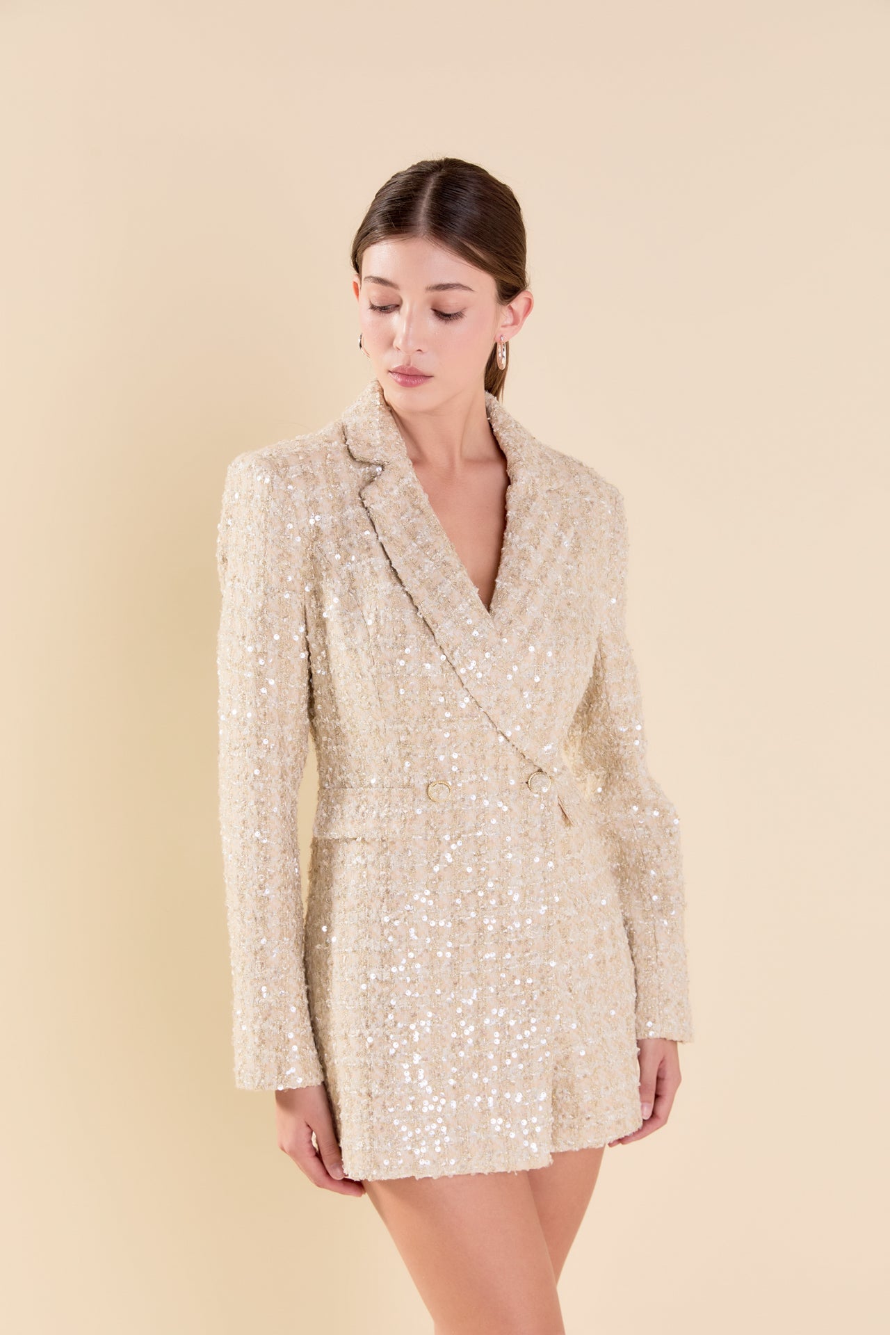 This ravishing Sequins Tweed Romper with its Double-Breasted style Skinny Lapels and Long Sleeves is a chic and unique piece of clothing. The beautiful tweed fabric is elaborately embellished with sequins for a striking effect. This romper is a must-have for any fashionista who intends to stand out from the crowd. Wear it for any formal or semi-formal occasion and you will be sure to draw admiring looks from all quarters.