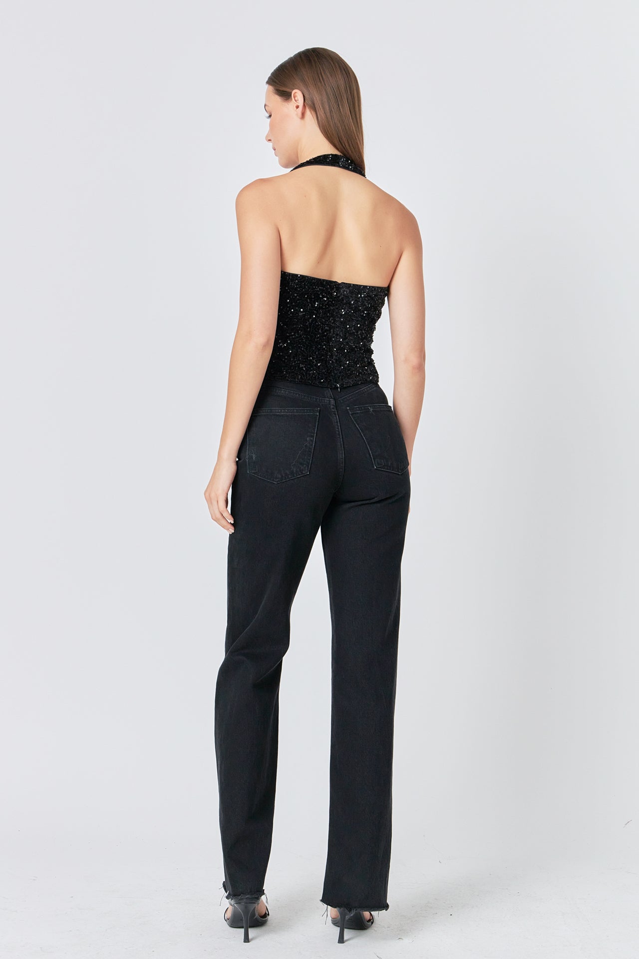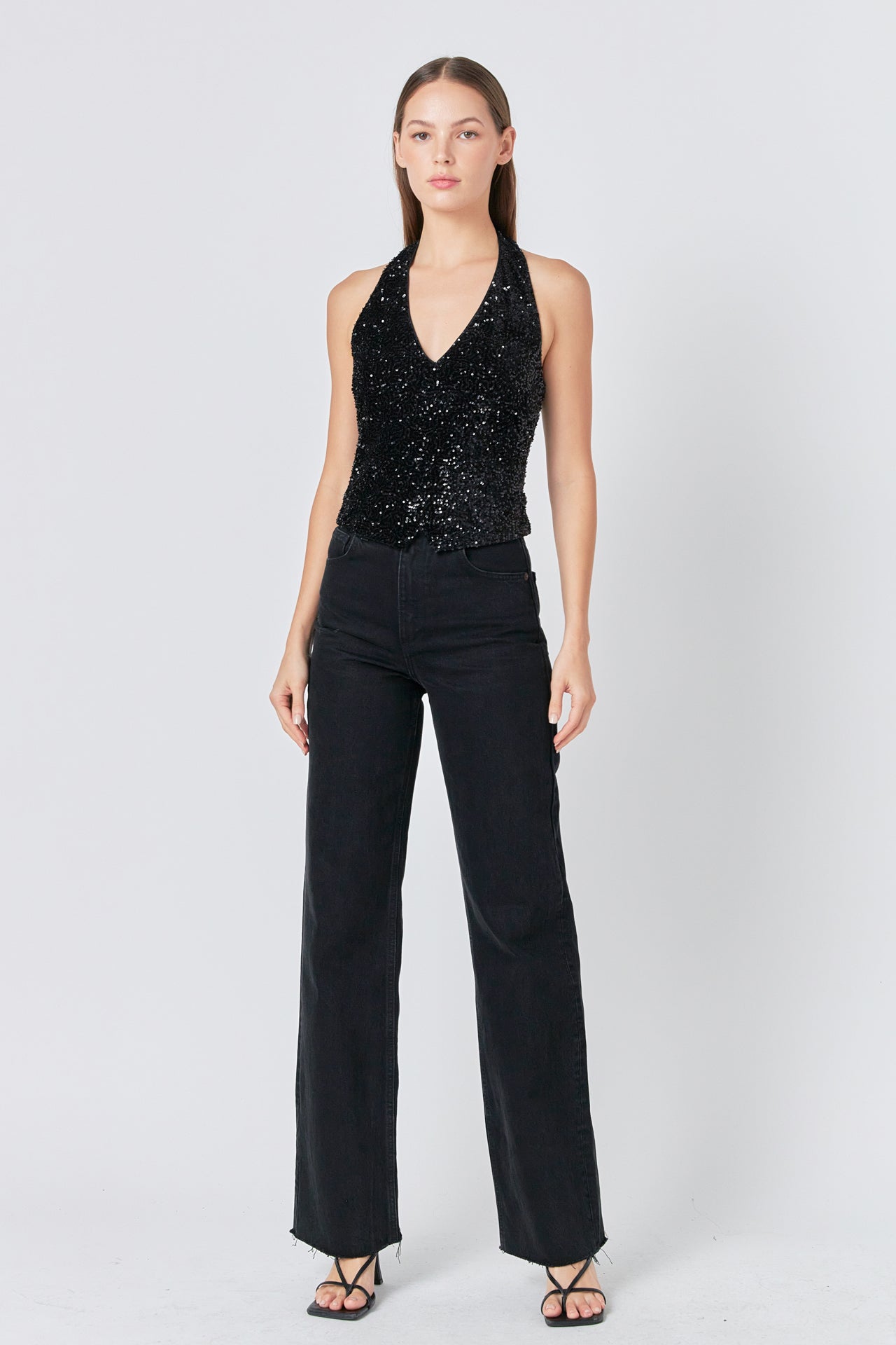 Elevate your wardrobe with our Sequins Velvet Halter Top. Made from luxurious velvet this top exudes sophistication and comfort. The halter neckline adds a touch of elegance while the back zipper ensures an effortless fit. The eye-catching sequin detailing creates a glamorous look perfect for any occasion. Pair it with high-waisted jeans for a chic casual look or dress it up with a pencil skirt for a night out. With its versatility and stunning design this top is a must-have in your closet. Shop now and shine bright with our Sequins Velvet Halter Top.