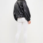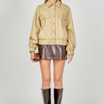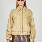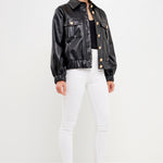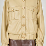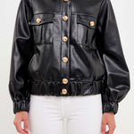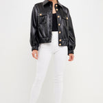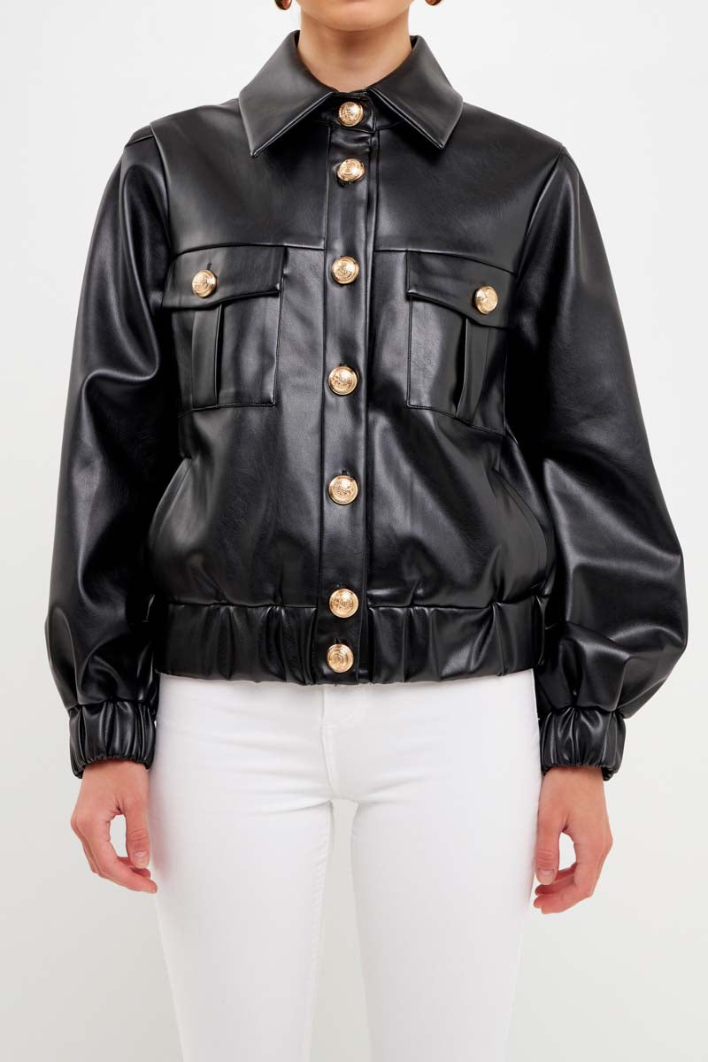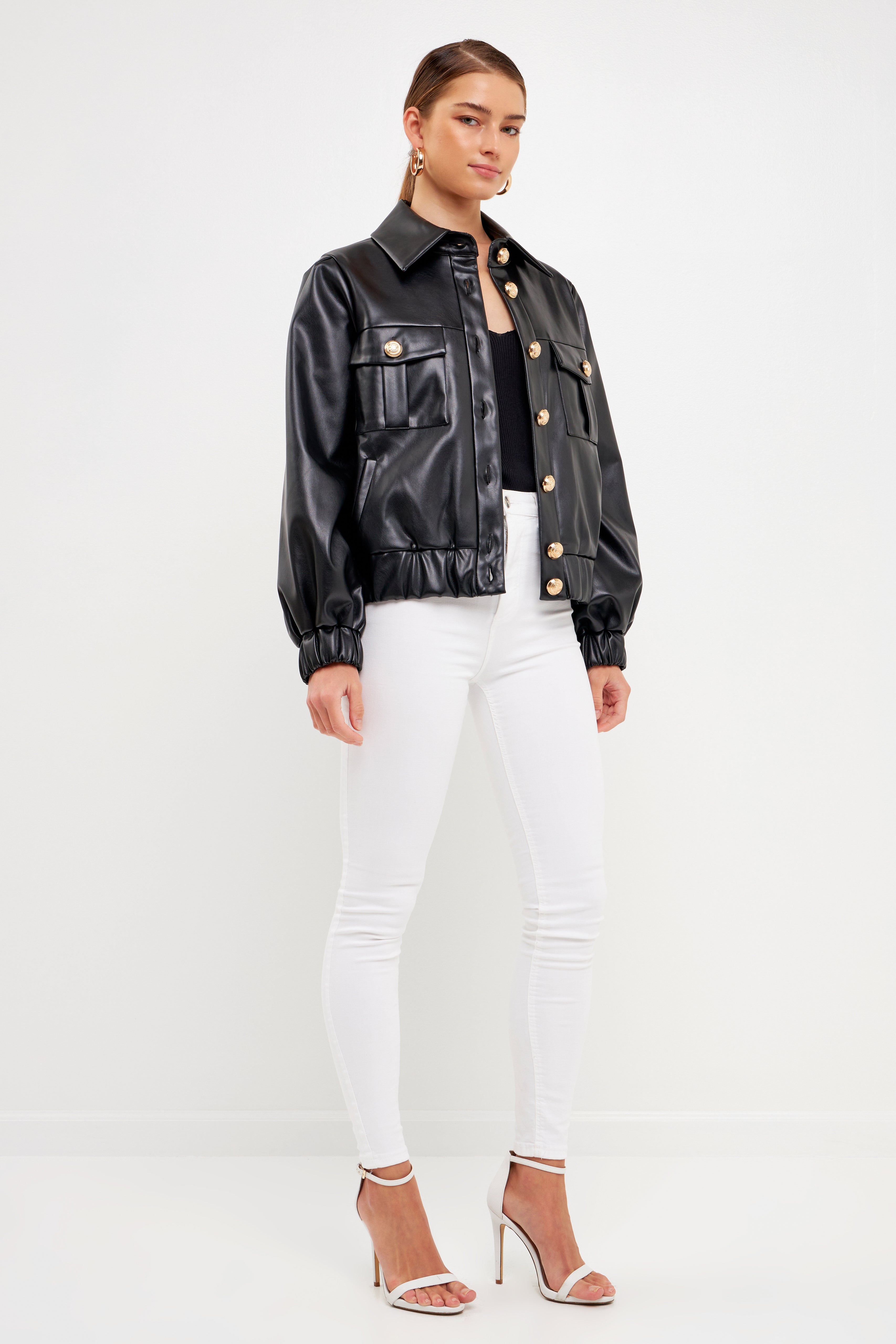 Made with luxuriously soft faux leather fabric, this jacket has front pockets and chest patch pockets and is accented with gold buttons.