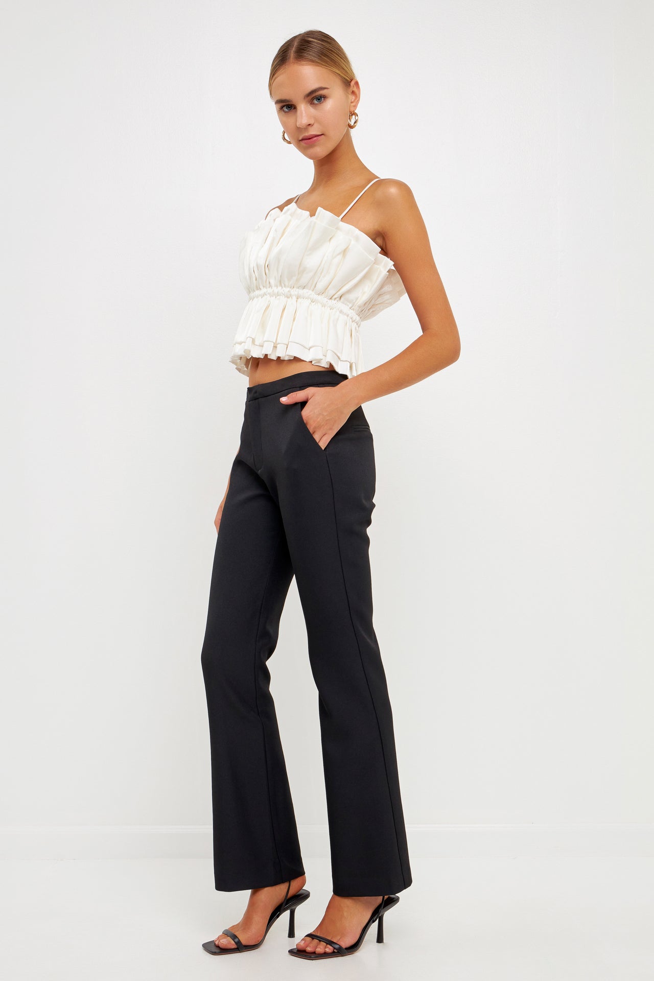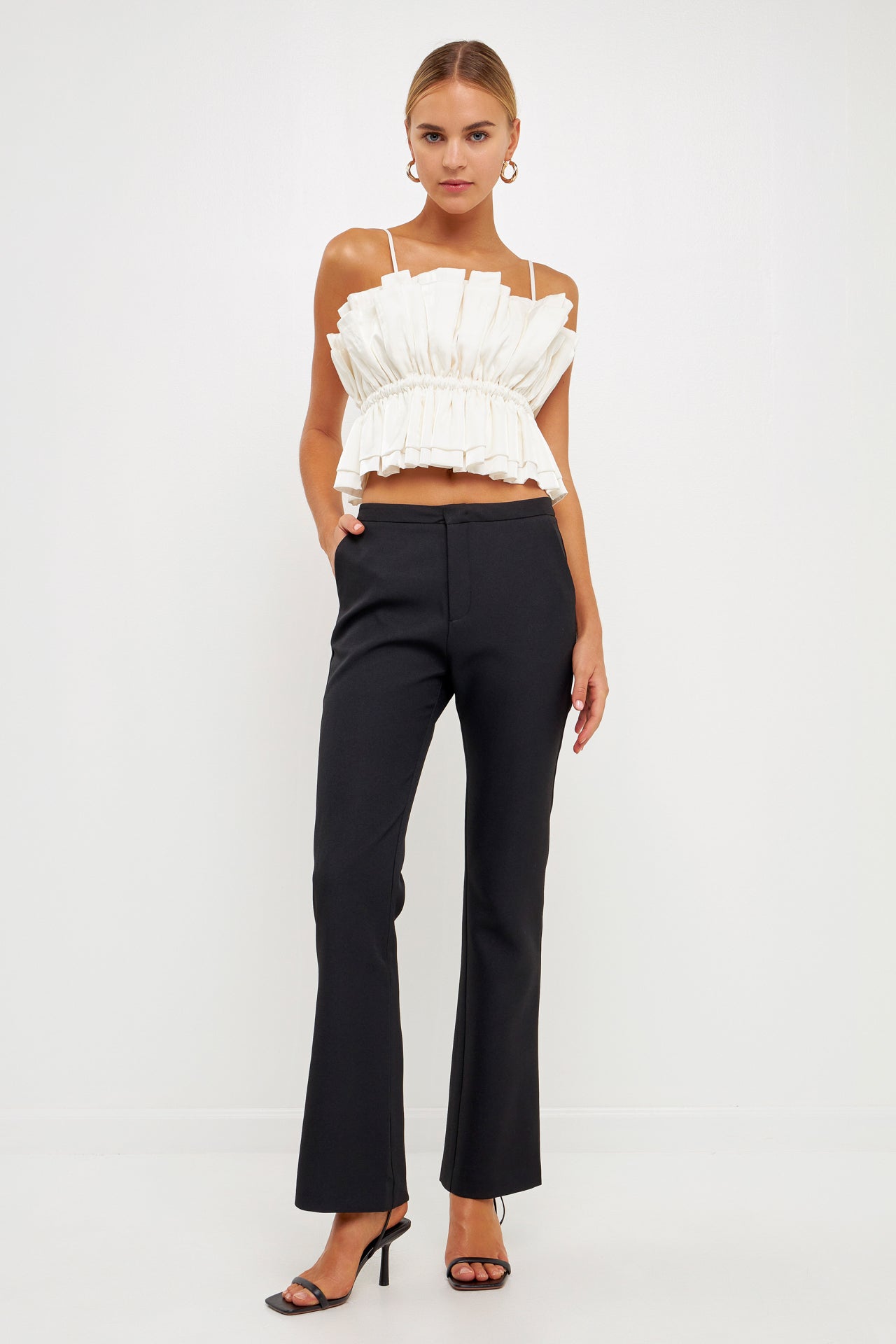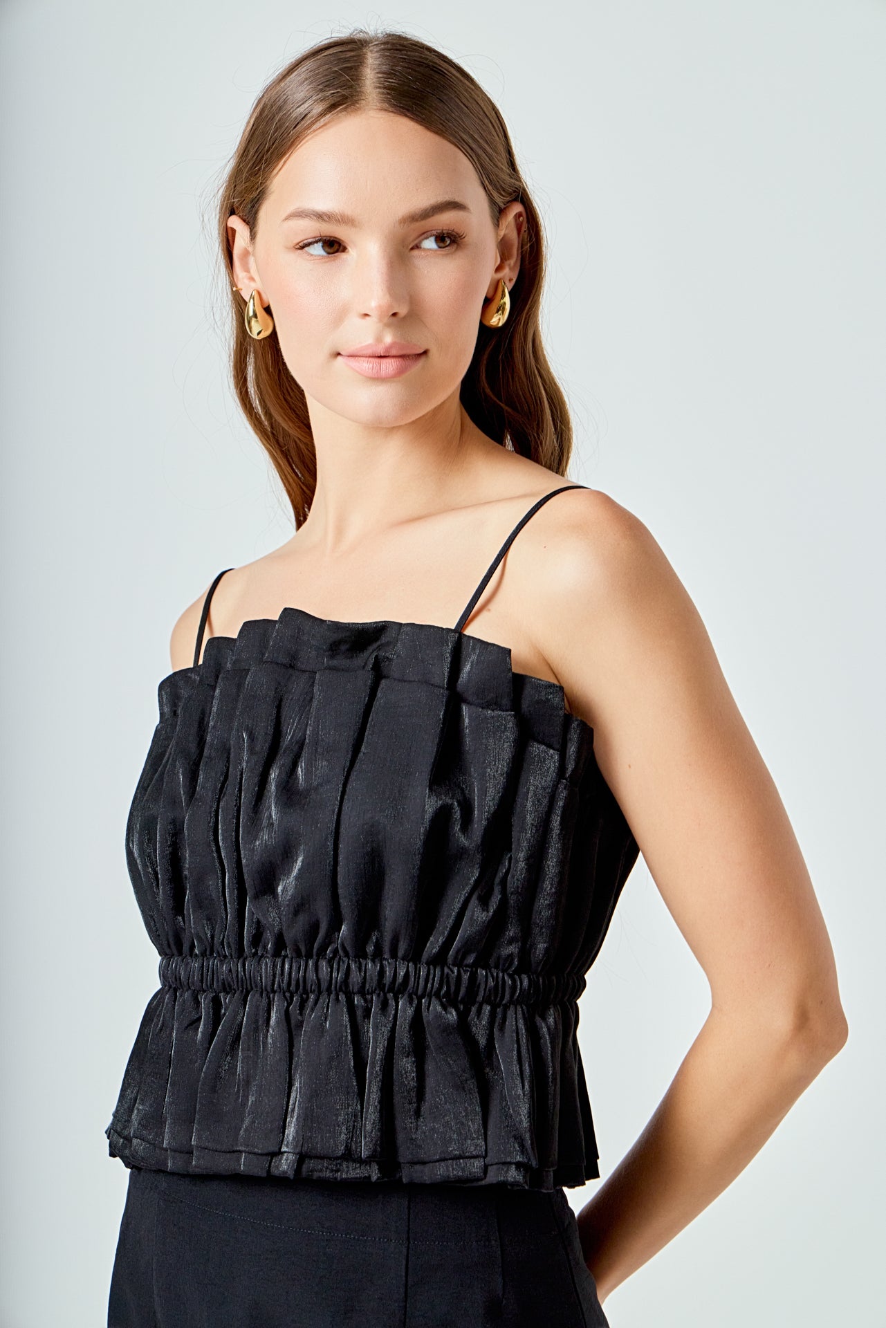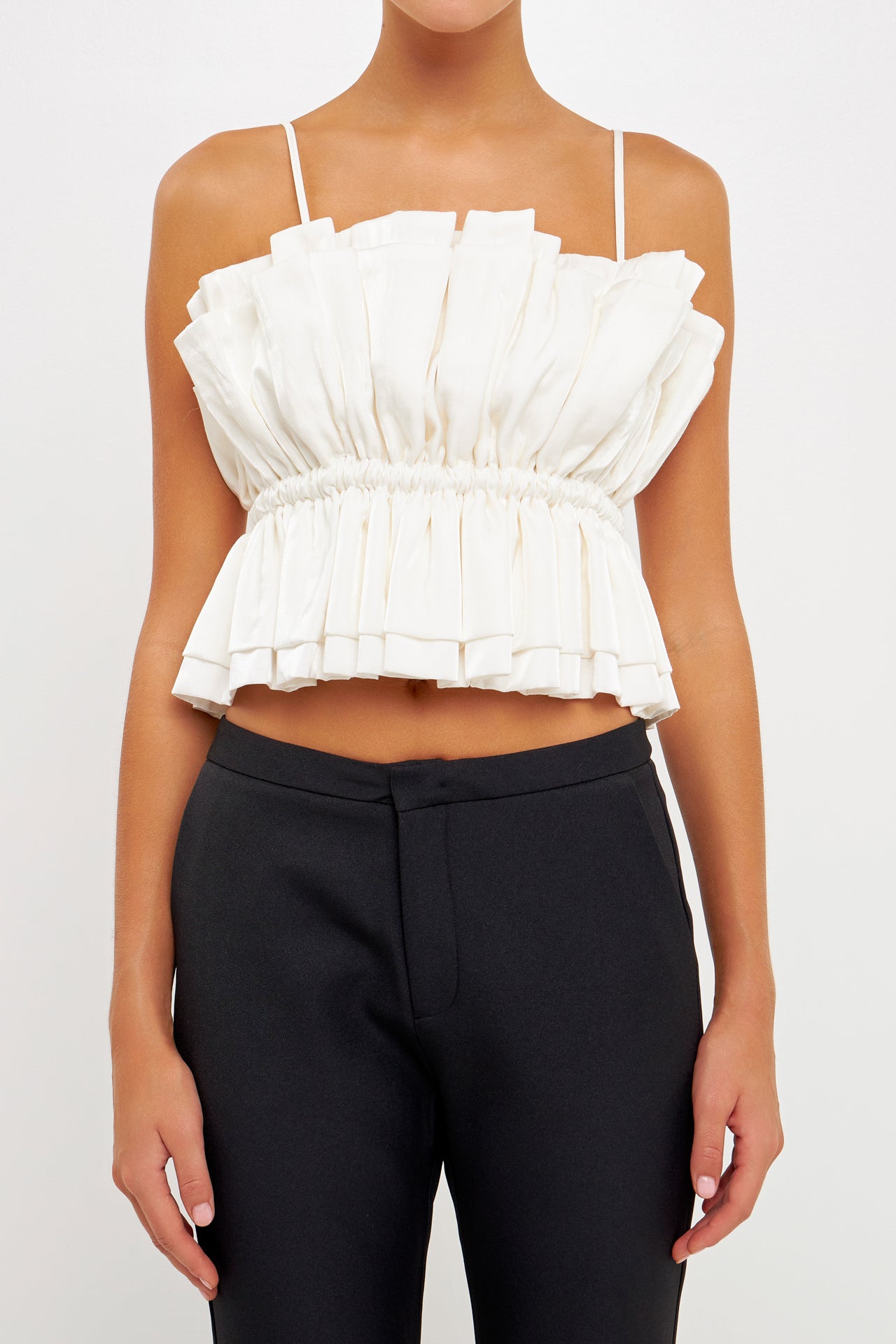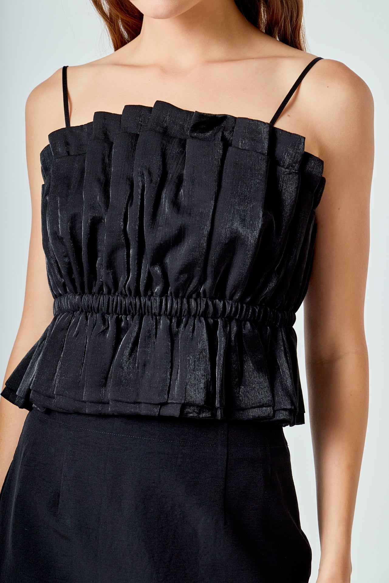 The Sheen Ruffled Strapless Top is a sophisticated versatile piece. Its strapless tube top style features accordion shirring at the neckline for subtle texture with elastic at the waist for a comfortable secure fit. A removable shoulder strap provides additional support and style options.