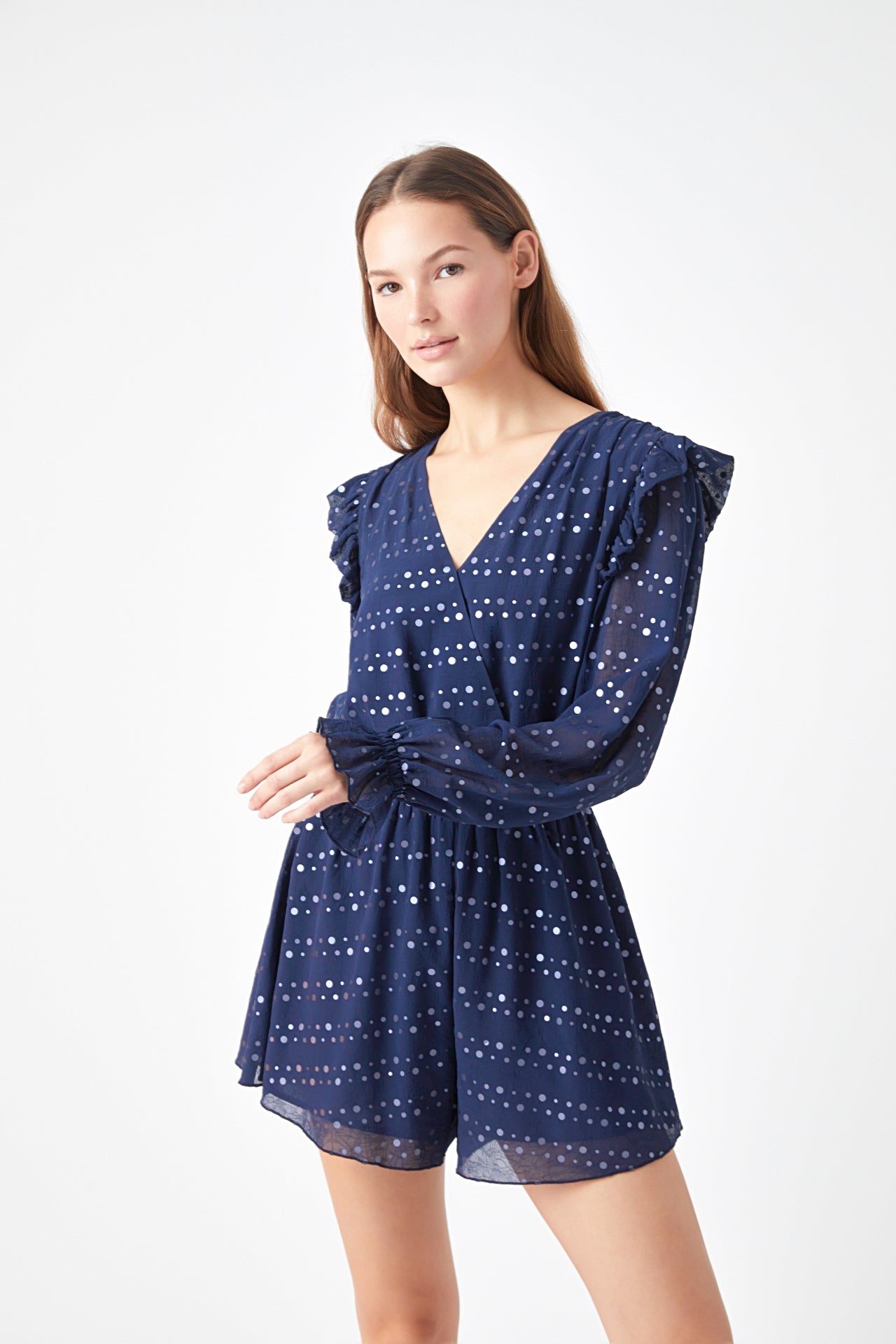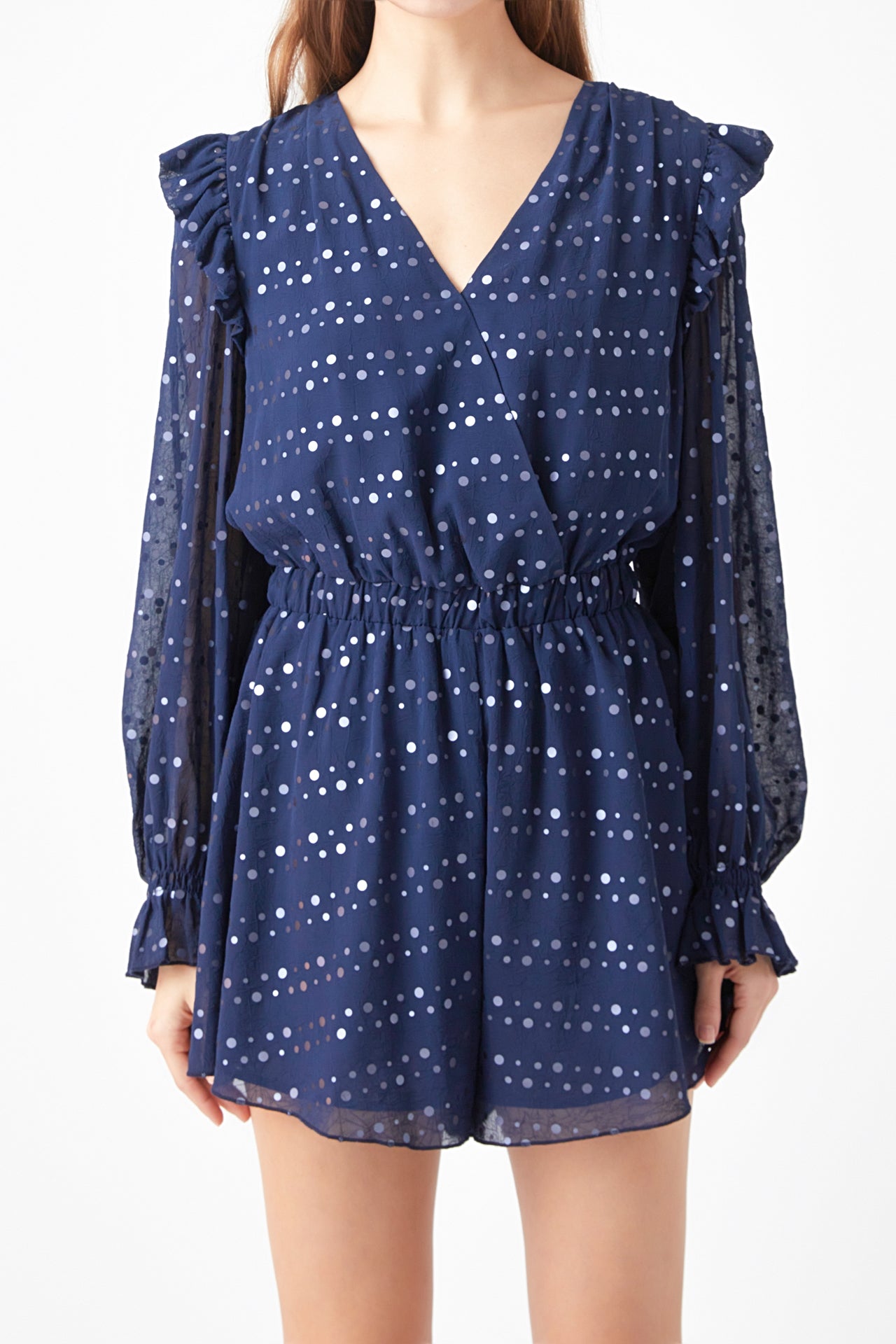 This Endless Rose romper is crafted from gorgeous fabric that features metallic dots. The design adds shine to your outfit in a subtle and classy way. The flowy shorts, airy sleeves, and elastic waistband make this romper extremely comfortable and easy to wear all day long. Plus, the surplice neckline has a metal clasp so you can cover up more if you wish.
