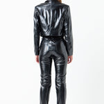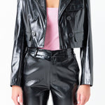 This Cropped Faux Leather Jacket is the perfect combination of comfort and edginess. It features a lapel collar with open front and has a boxy, structured fit with shoulder pads. The buttons add chic and sophisticated look to it. This jacket is perfect to enhance your wardrobe edgy wardrobe. Elevate your style game now with this fashionable piece!