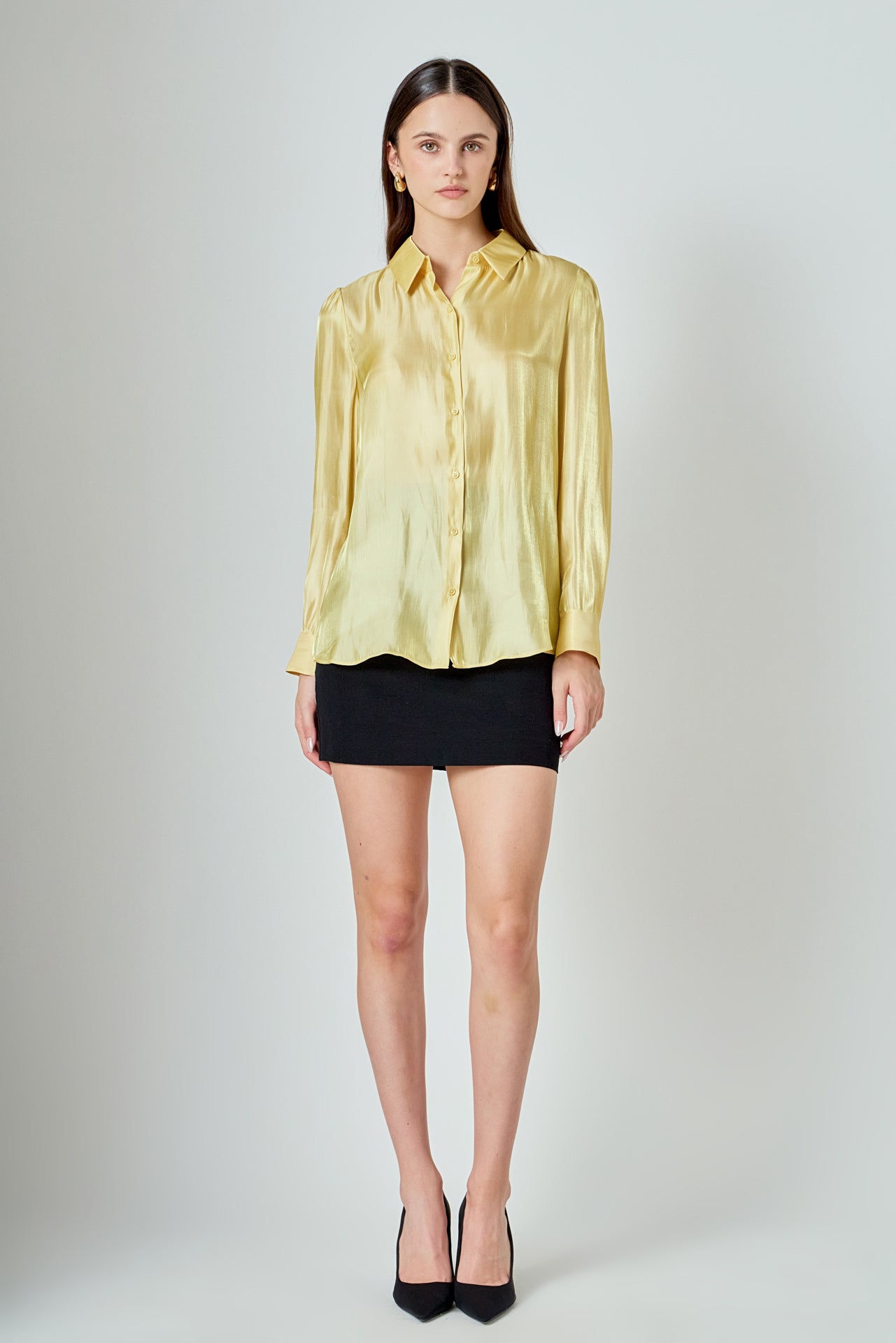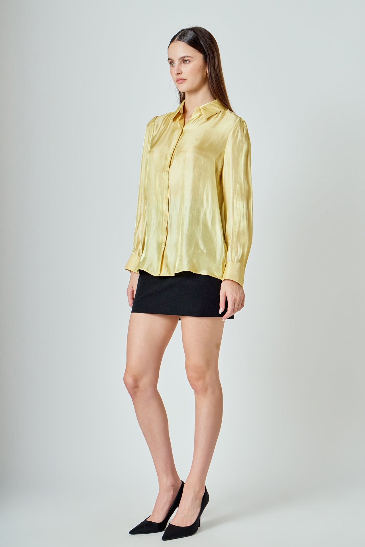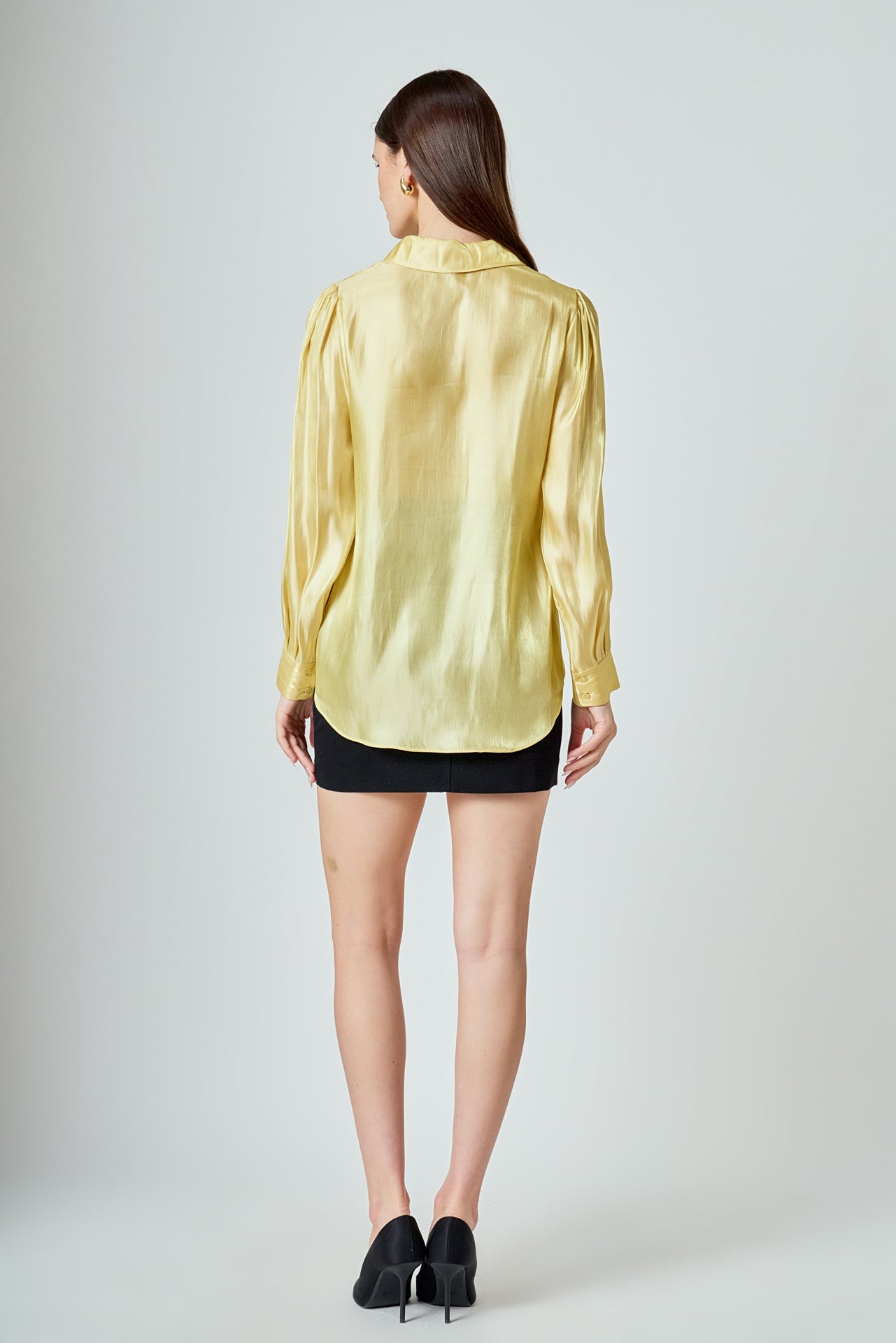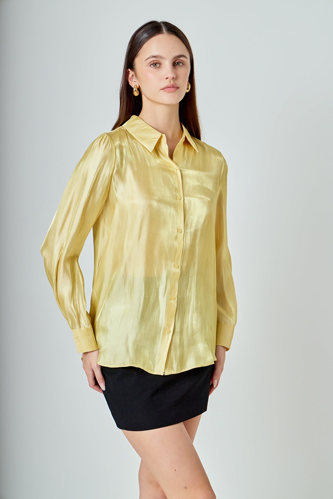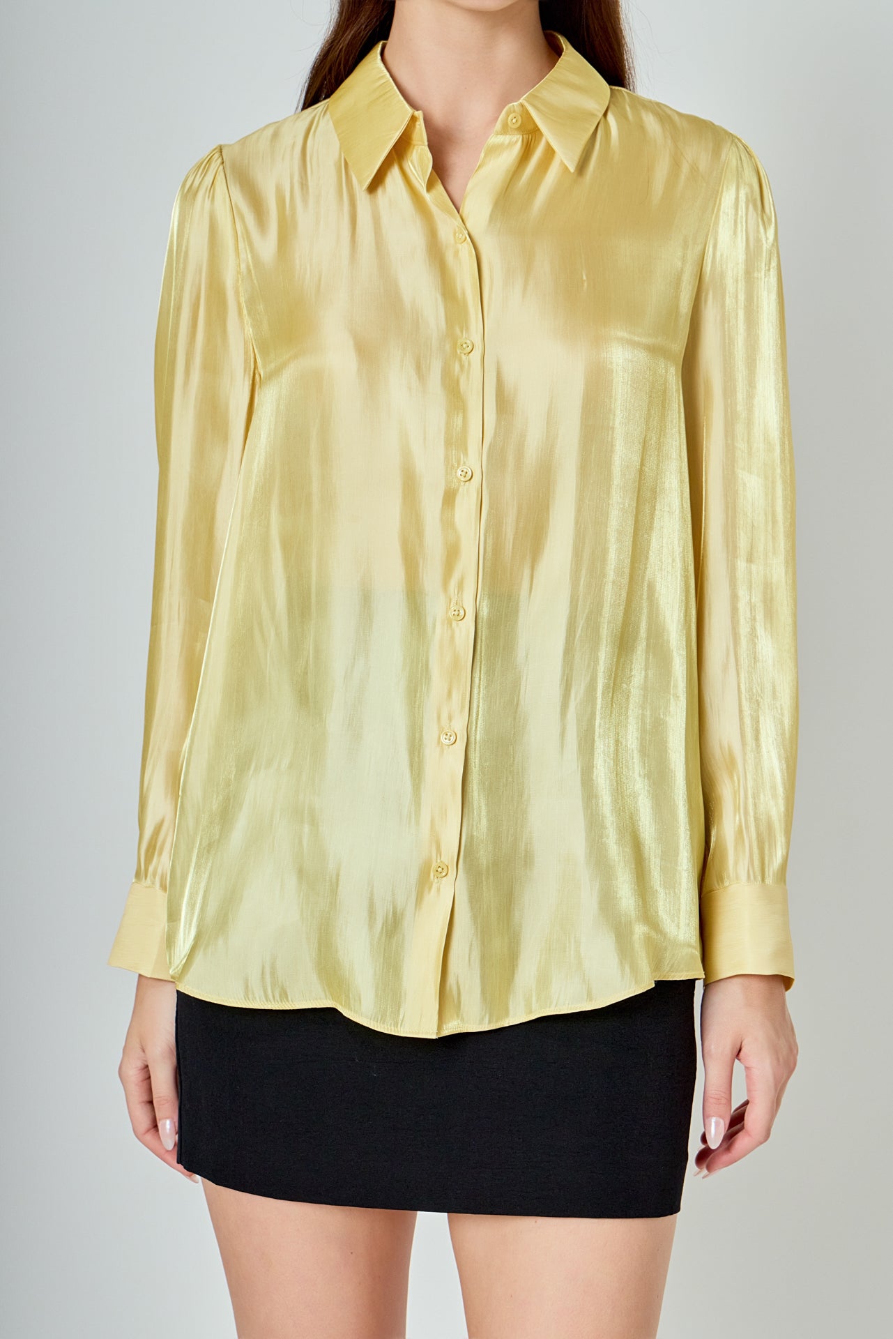 Classic shirt details like buttoned cuffs a curved hemline and center-front buttons make up this Shiny Dress Shirt. The iridescent slightly sheer fabric elevates this wardrobe staple.