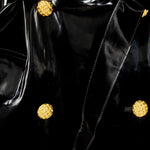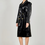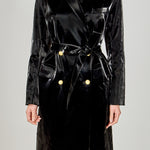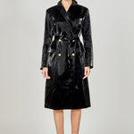 This Shiny Vegan Leather Trench Coat is a must-have for any stylish wardrobe. With its classic double-breasted design and long length it's sure to make an impact. Crafted from luxe vegan leather it adds a sophisticated touch to any look. Please the critics in style and be the envy of all with this timeless trench.