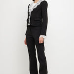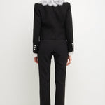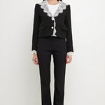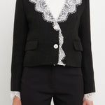 Made with lightweight tweed this jacket has a delicate lace collar and lace trim along the sleeves and front opening. It's completed with front pockets for practicality and shoulder pads to add structure.
